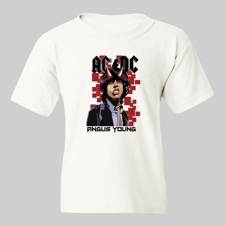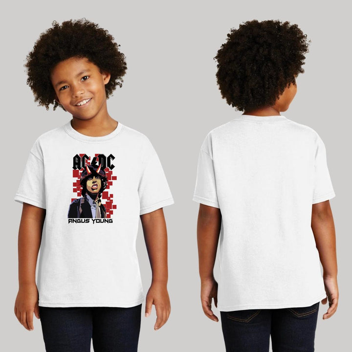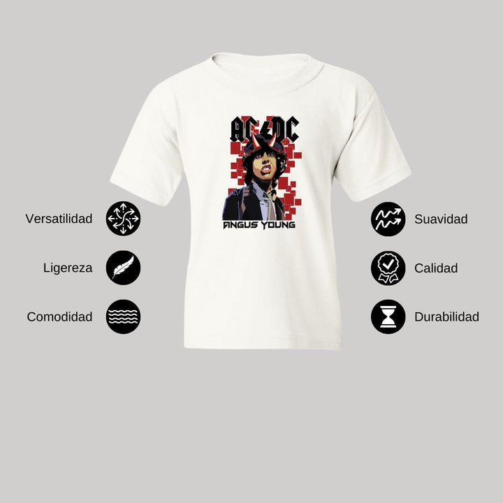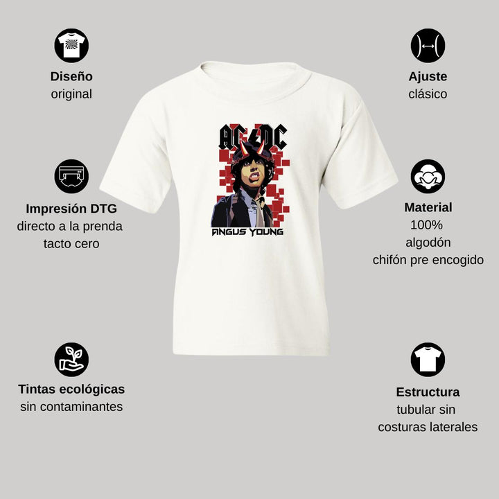 Playera infantil manga corta, cuello redondo para niño o niña nueva, diseño AC/DC Angus young original impreso con tecnología DTG (directo a la prenda) tacto cero, uso casual o deportiva, 100% algodón chifón pre encogido, estructura tubular sin costuras laterales. Colores de camiseta: Blanco.