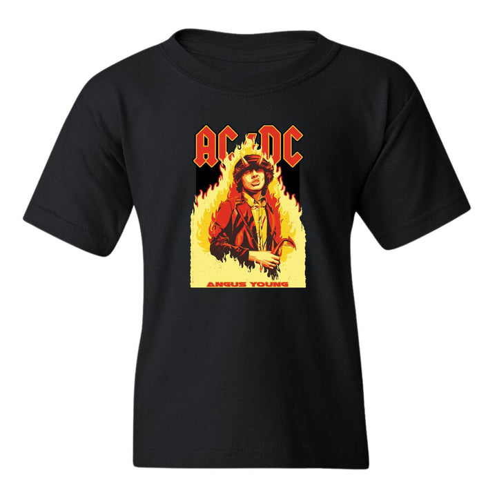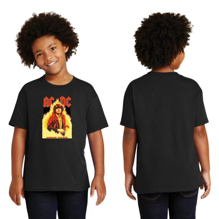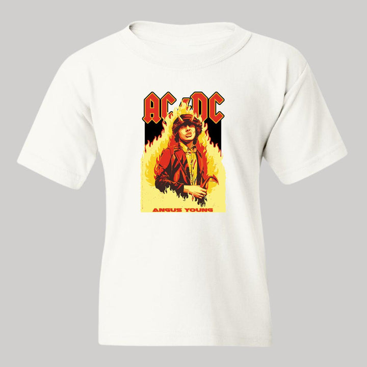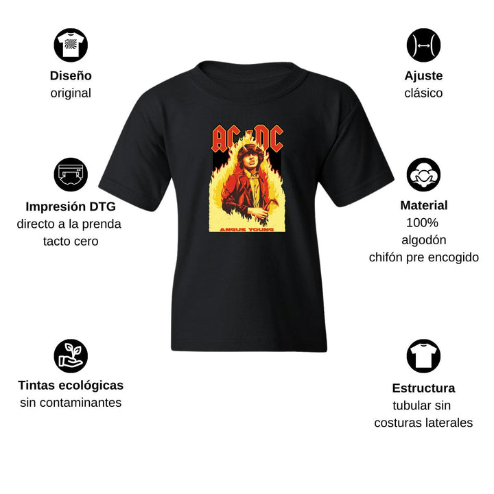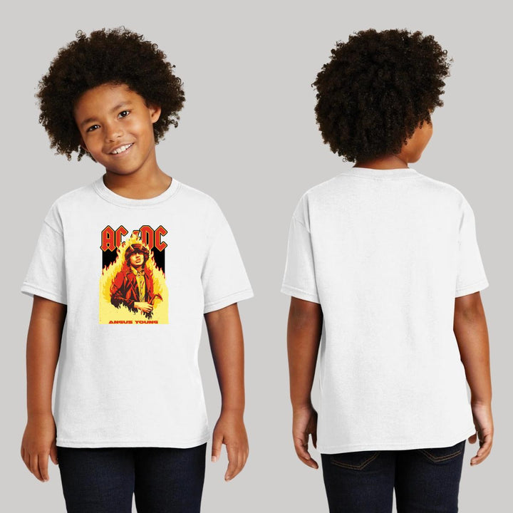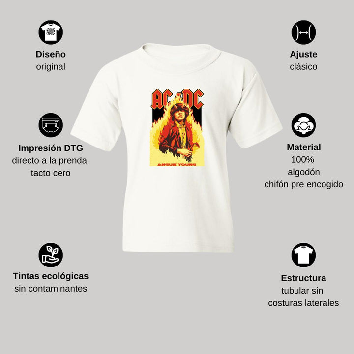 Playera infantil manga corta, cuello redondo para niño o niña nueva, diseño AC/DC Angus young original impreso con tecnología DTG (directo a la prenda) tacto cero, uso casual o deportiva, 100% algodón chifón pre encogido, estructura tubular sin costuras laterales. Colores de camiseta: Blanco.
