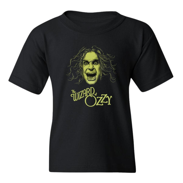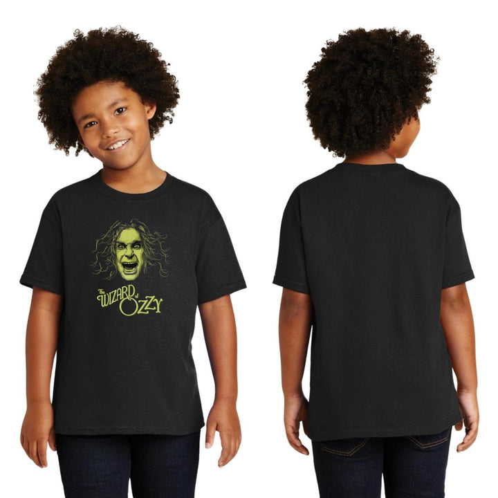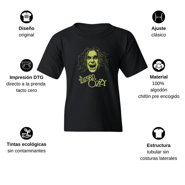 Playera infantil manga corta, cuello redondo para niño o niña nueva, diseño Ozzy Osbourne The Wizard original impreso con tecnología DTG (directo a la prenda) tacto cero, uso casual o deportiva, 100% algodón chifón pre encogido, estructura tubular sin costuras laterales. Colores de camiseta: Negro.