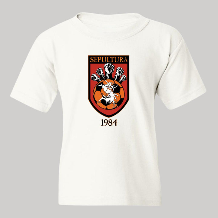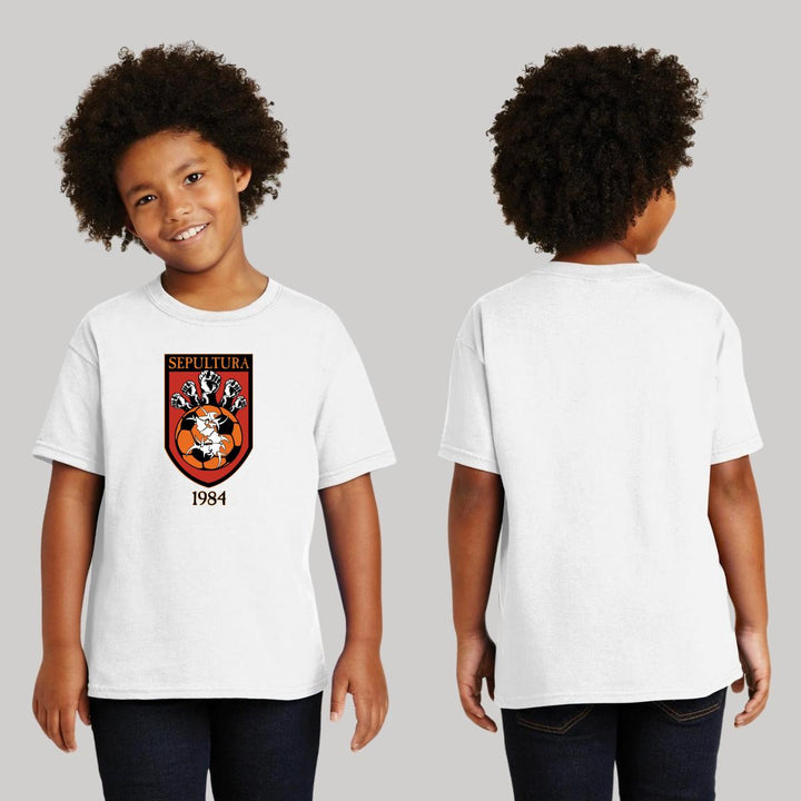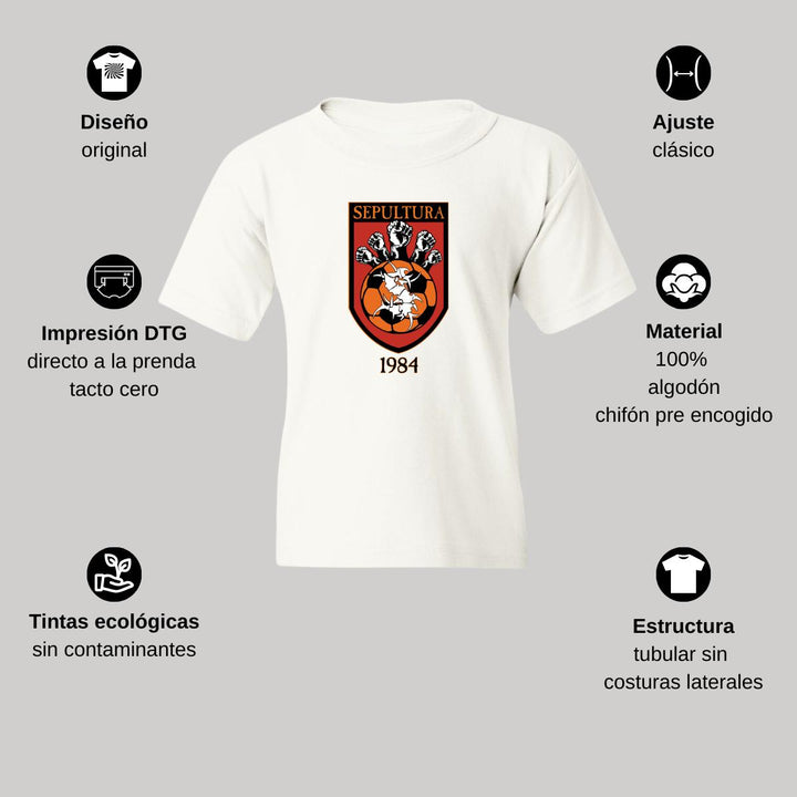 Playera infantil manga corta, cuello redondo para niño o niña nueva, diseño Sepultura 1984 original impreso con tecnología DTG (directo a la prenda) tacto cero, uso casual o deportiva, 100% algodón chifón pre encogido, estructura tubular sin costuras laterales. Colores de camiseta: Blanco.