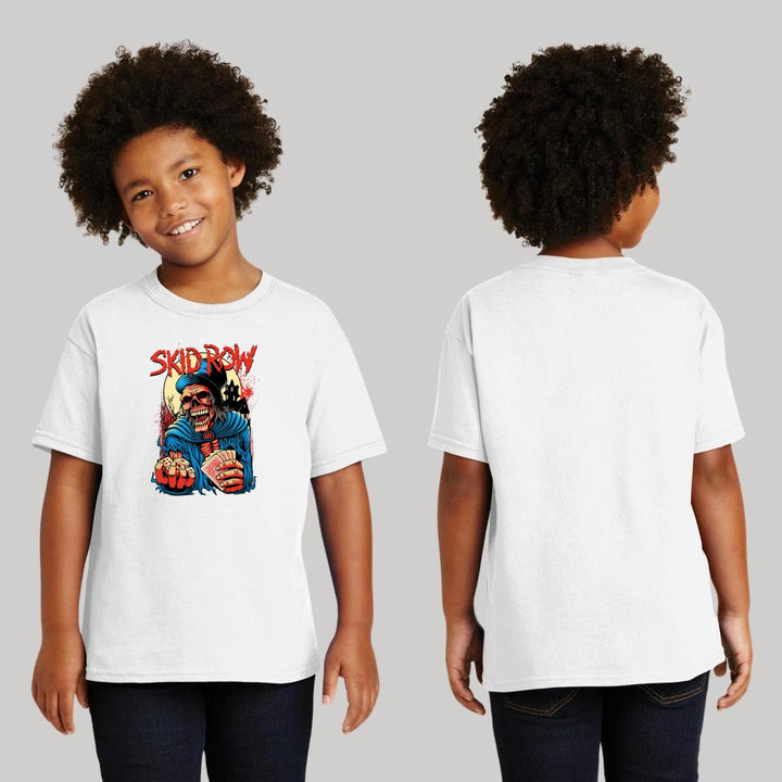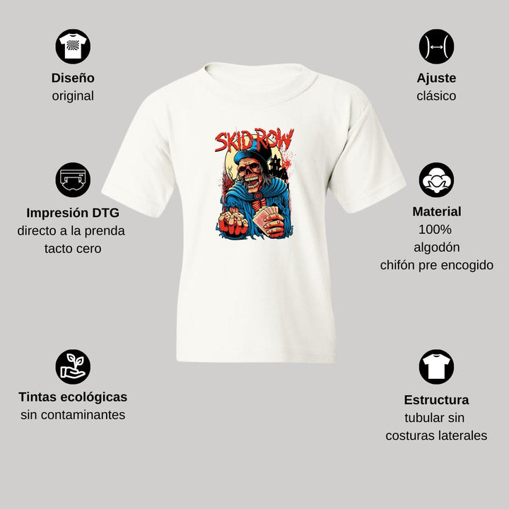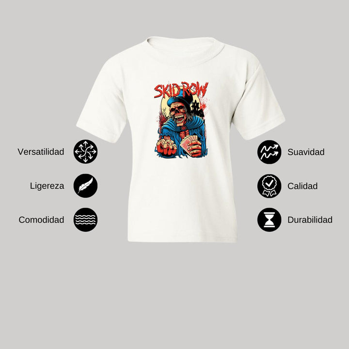 Playera infantil manga corta, cuello redondo para niño o niña nueva, diseño Skid Row Esqueleto original impreso con tecnología DTG (directo a la prenda) tacto cero, uso casual o deportiva, 100% algodón chifón pre encogido, estructura tubular sin costuras laterales. Colores de camiseta: Blanco.