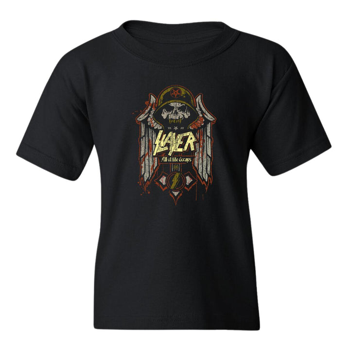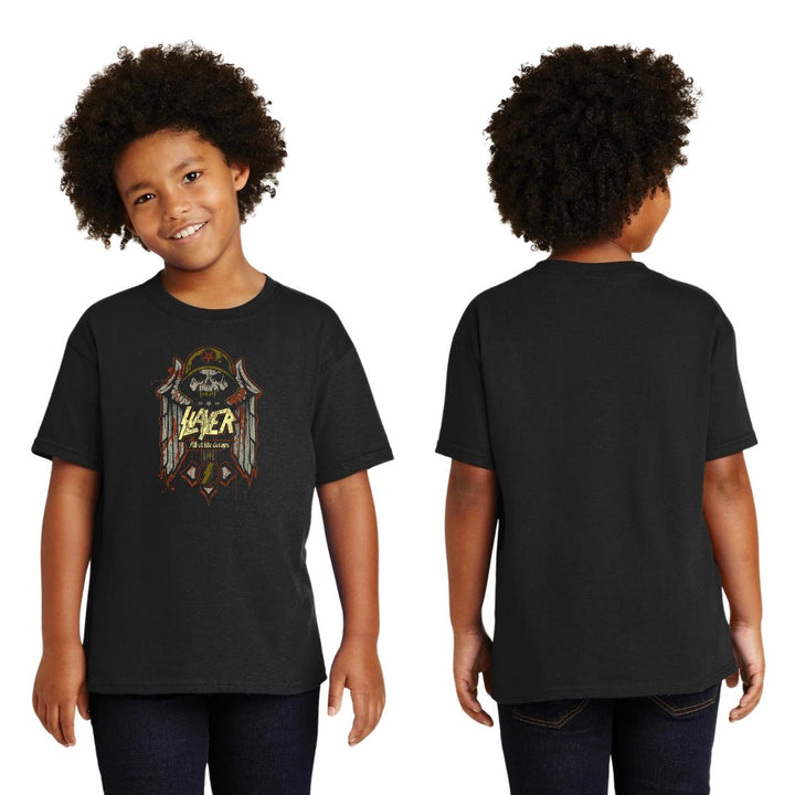 Playera infantil manga corta, cuello redondo para niño o niña nueva, diseño Slayer All of life decays original impreso con tecnología DTG (directo a la prenda) tacto cero, uso casual o deportiva, 100% algodón chifón pre encogido, estructura tubular sin costuras laterales. Colores de camiseta: Negro.