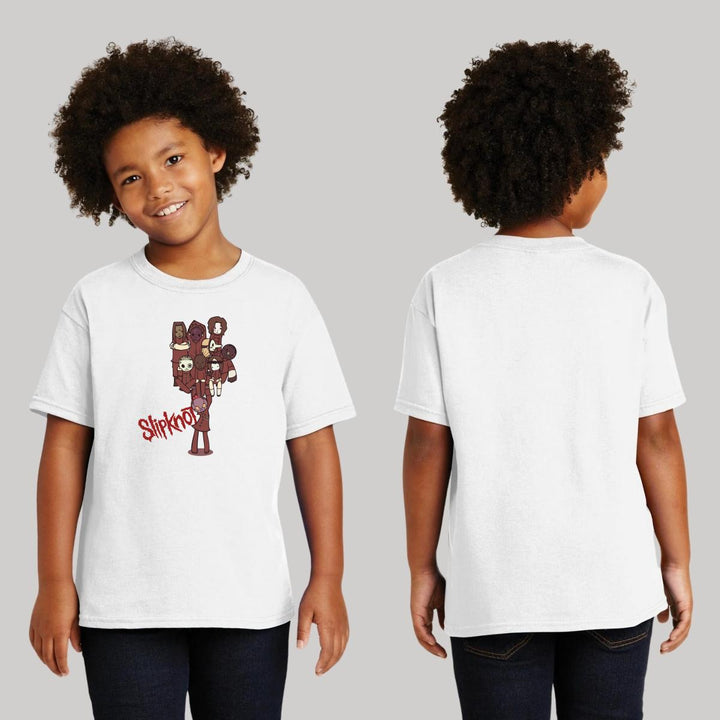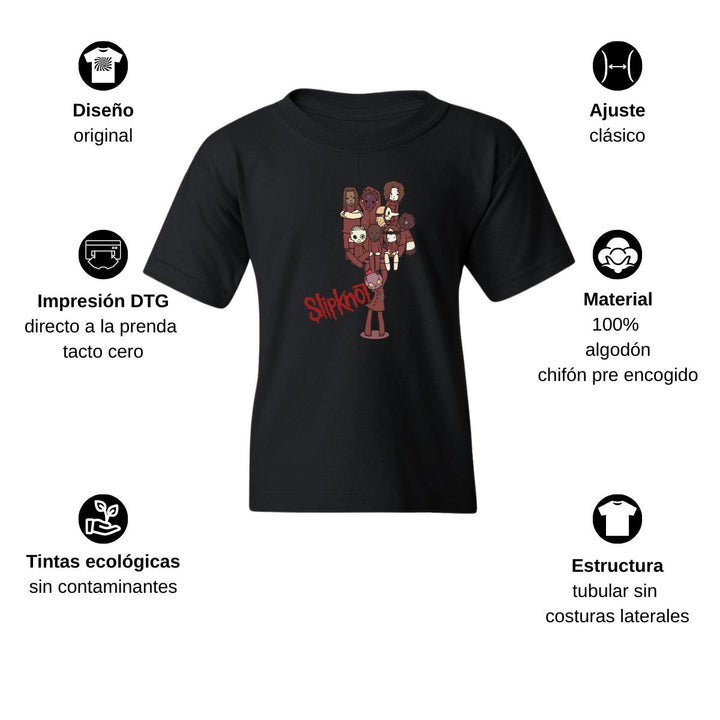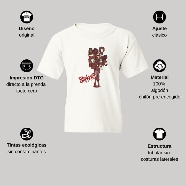 Playera infantil manga corta, cuello redondo para niño o niña nueva, diseño Slipknot Póster Máscaras original impreso con tecnología DTG (directo a la prenda) tacto cero, uso casual o deportiva, 100% algodón chifón pre encogido, estructura tubular sin costuras laterales. Colores de camiseta: Blanco.