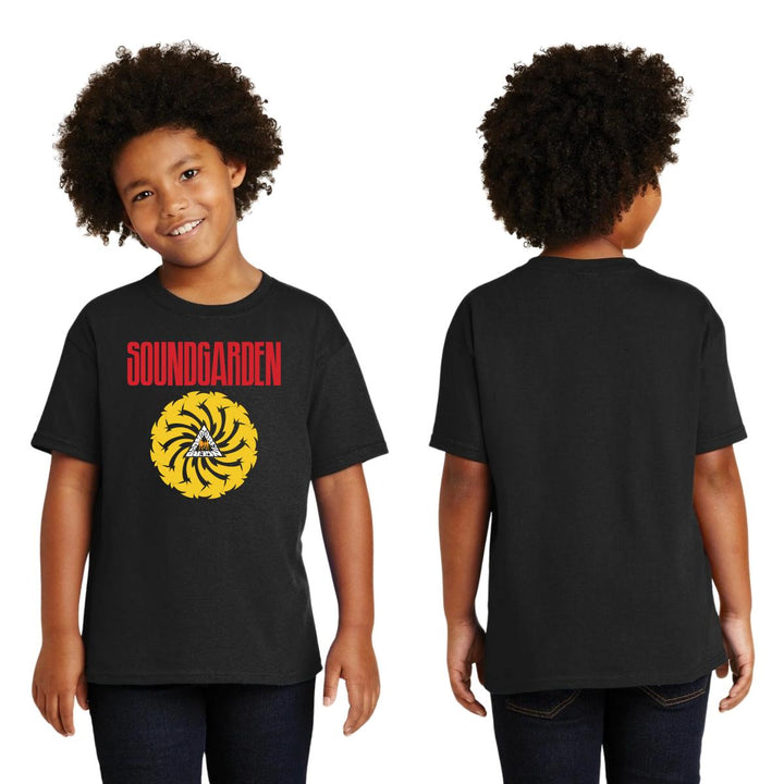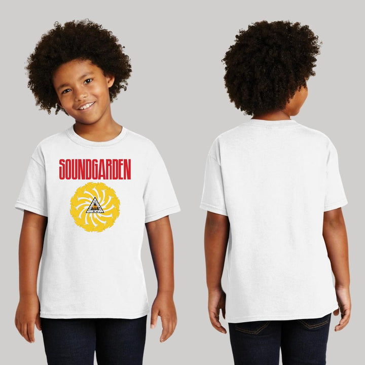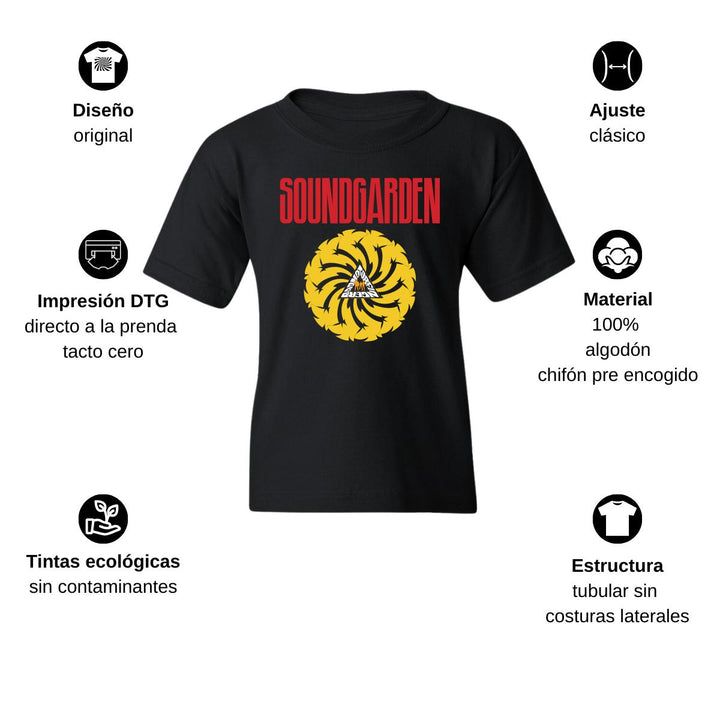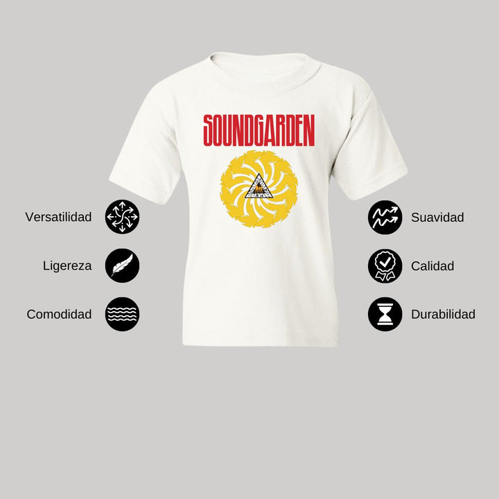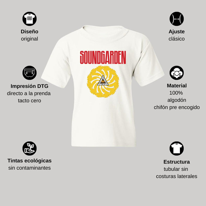 Playera infantil manga corta, cuello redondo para niño o niña nueva, diseño SoundGarden Póster original impreso con tecnología DTG (directo a la prenda) tacto cero, uso casual o deportiva, 100% algodón chifón pre encogido, estructura tubular sin costuras laterales. Colores de camiseta: Blanco.