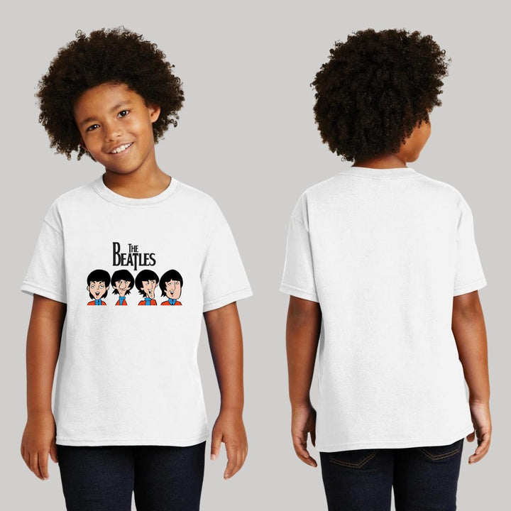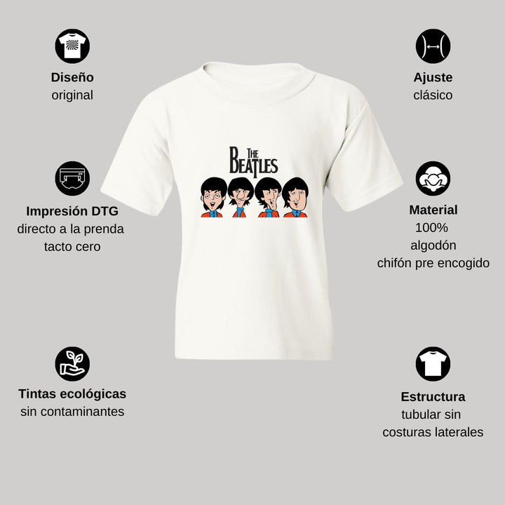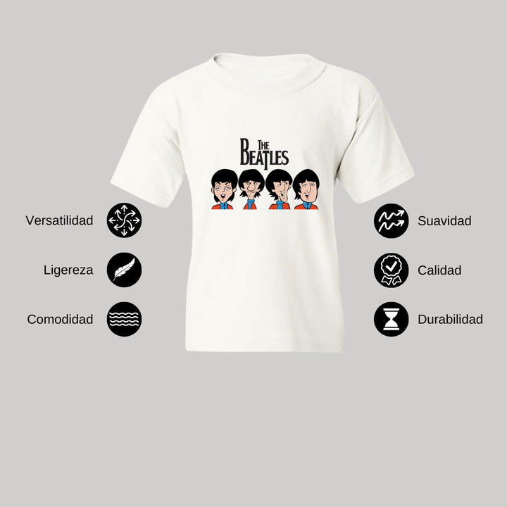 Playera infantil manga corta, cuello redondo para niño o niña nueva, diseño The Beatles Ilustración Miembros original impreso con tecnología DTG (directo a la prenda) tacto cero, uso casual o deportiva, 100% algodón chifón pre encogido, estructura tubular sin costuras laterales. Colores de camiseta: Blanco.