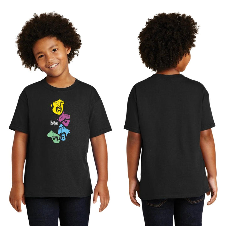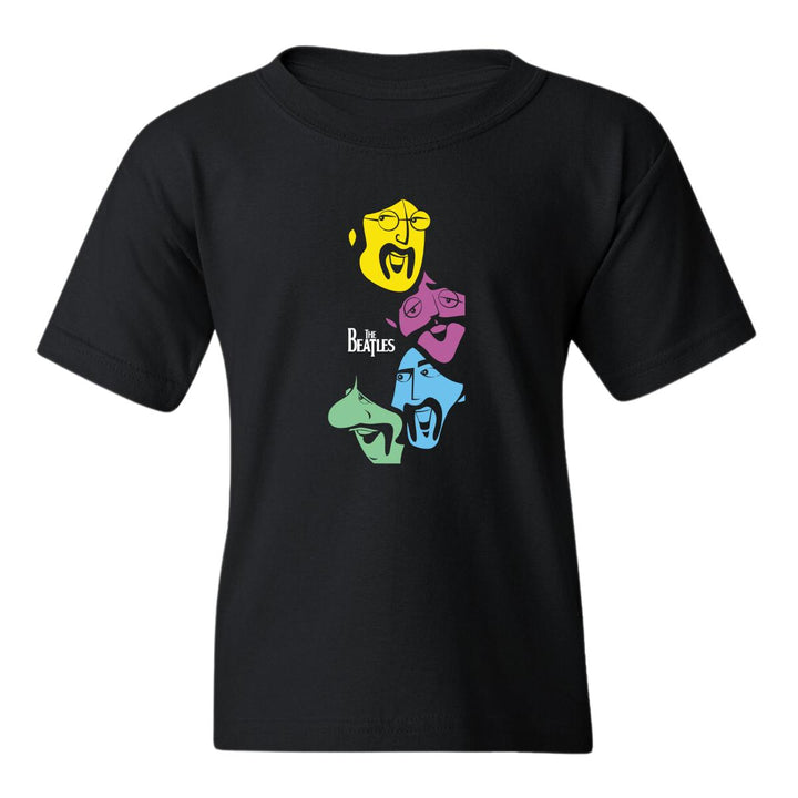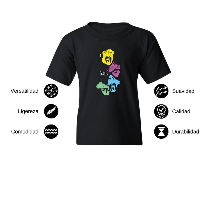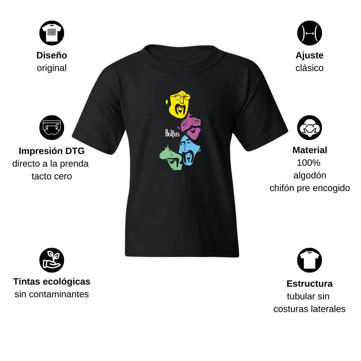 Playera infantil manga corta, cuello redondo para niño o niña nueva, diseño The Beatles Rostros original impreso con tecnología DTG (directo a la prenda) tacto cero, uso casual o deportiva, 100% algodón chifón pre encogido, estructura tubular sin costuras laterales. Colores de camiseta: Negro.