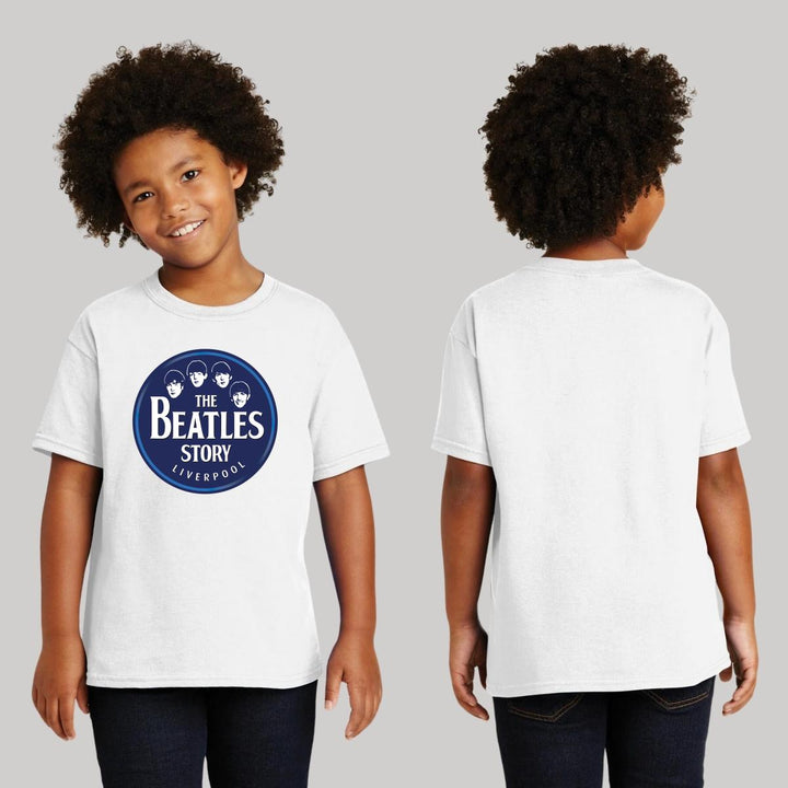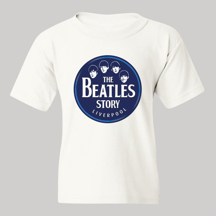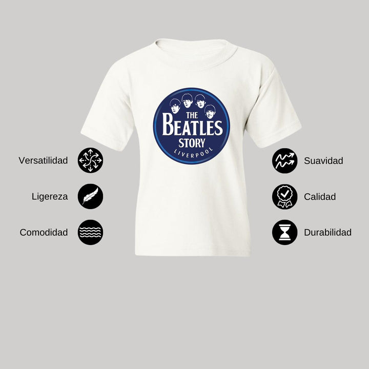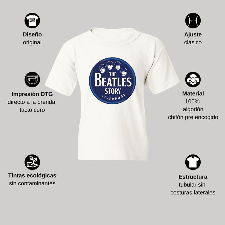 Playera infantil manga corta, cuello redondo para niño o niña nueva, diseño The Beatles Story original impreso con tecnología DTG (directo a la prenda) tacto cero, uso casual o deportiva, 100% algodón chifón pre encogido, estructura tubular sin costuras laterales. Colores de camiseta: Blanco.