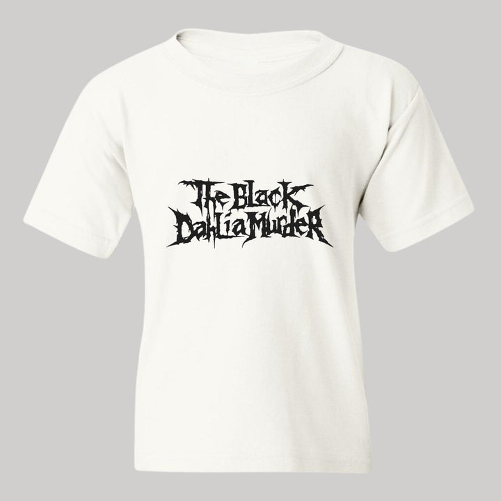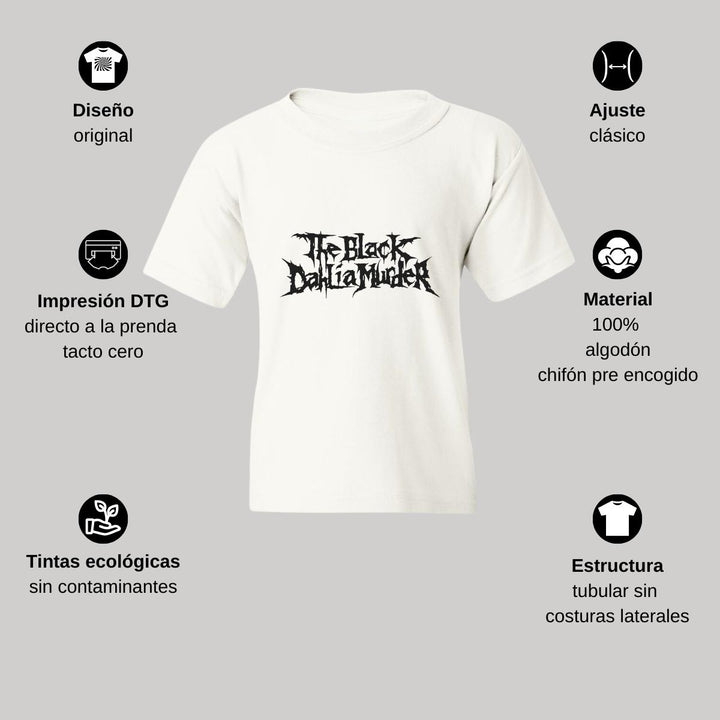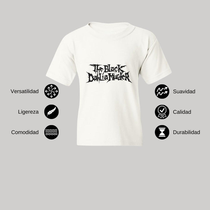 Playera infantil manga corta, cuello redondo para niño o niña nueva, diseño The Black Dahlia Murder Logo original impreso con tecnología DTG (directo a la prenda) tacto cero, uso casual o deportiva, 100% algodón chifón pre encogido, estructura tubular sin costuras laterales. Colores de camiseta: Blanco.