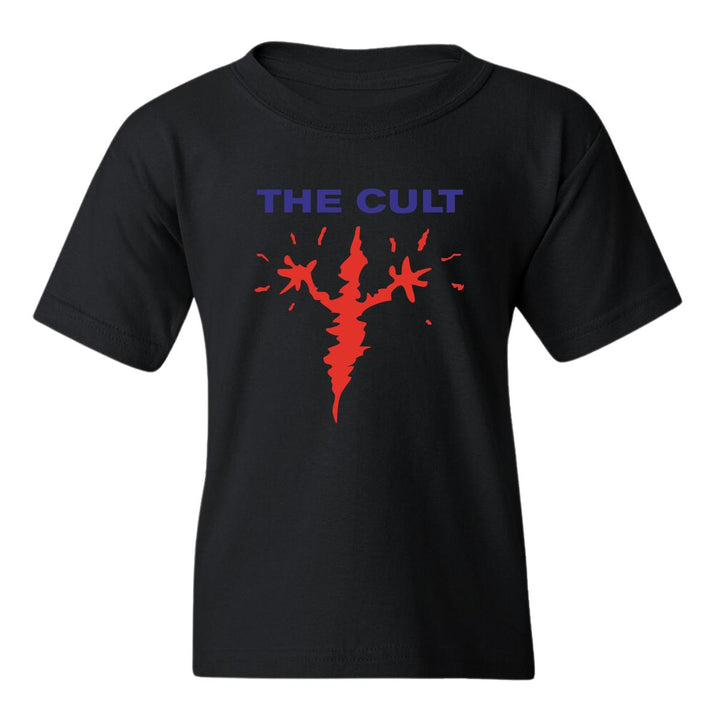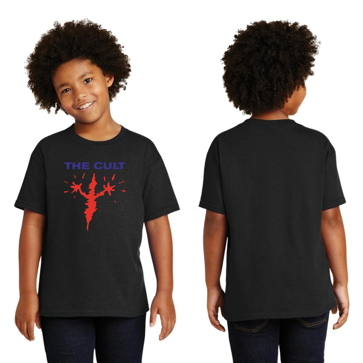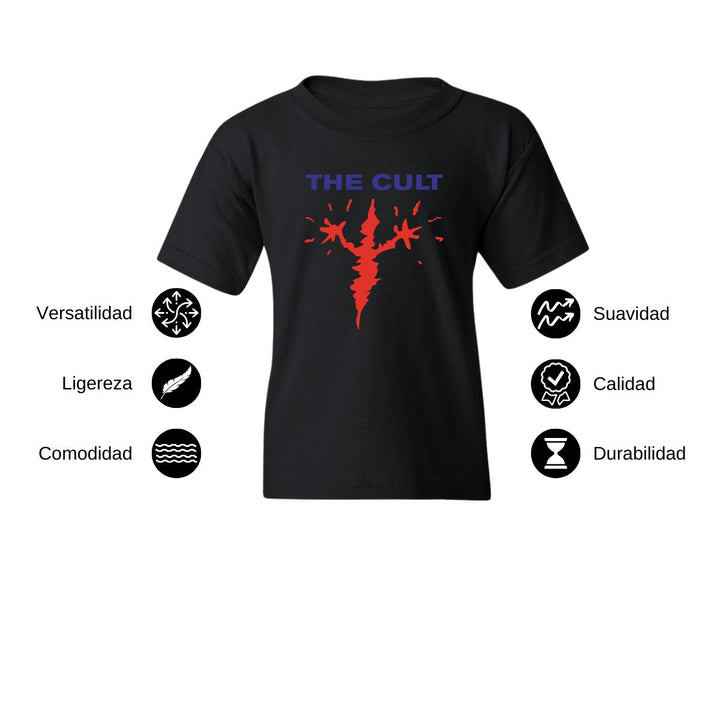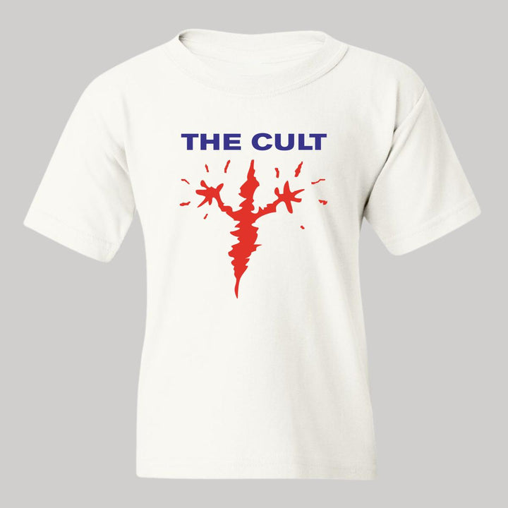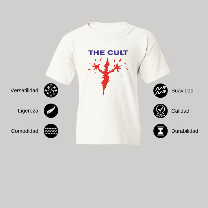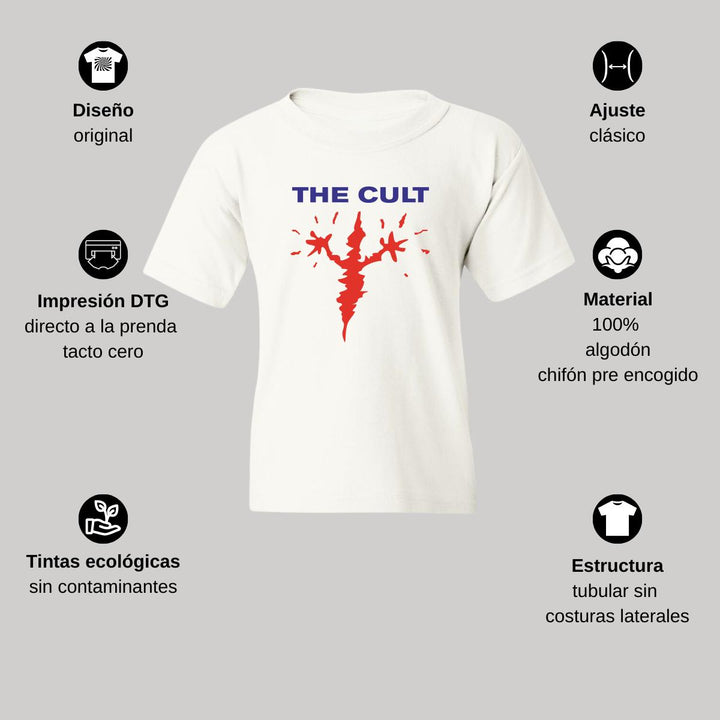 Playera infantil manga corta, cuello redondo para niño o niña nueva, diseño The Cult Logo original impreso con tecnología DTG (directo a la prenda) tacto cero, uso casual o deportiva, 100% algodón chifón pre encogido, estructura tubular sin costuras laterales. Colores de camiseta: Blanco.