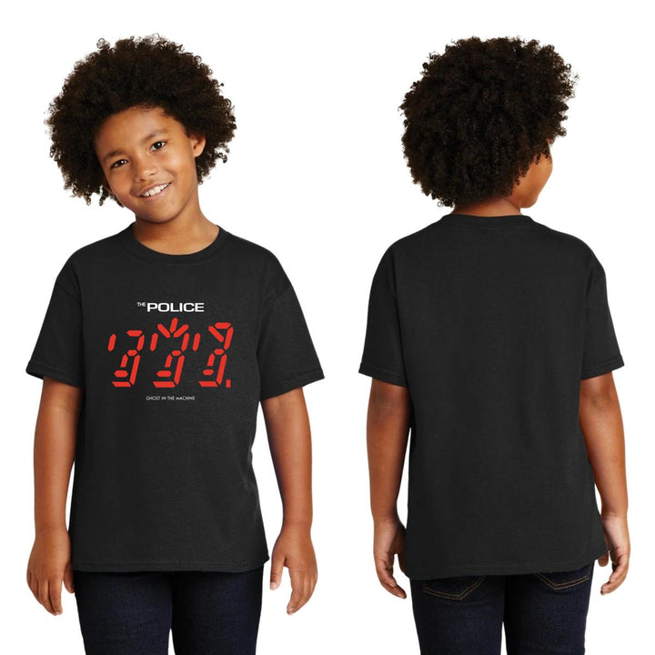 Playera infantil manga corta, cuello redondo para niño o niña nueva, diseño The Police Ghost in the machine original impreso con tecnología DTG (directo a la prenda) tacto cero, uso casual o deportiva, 100% algodón chifón pre encogido, estructura tubular sin costuras laterales. Colores de camiseta: Negro.