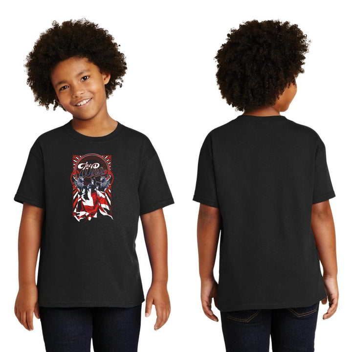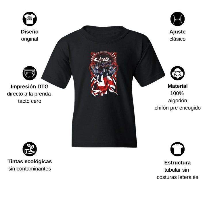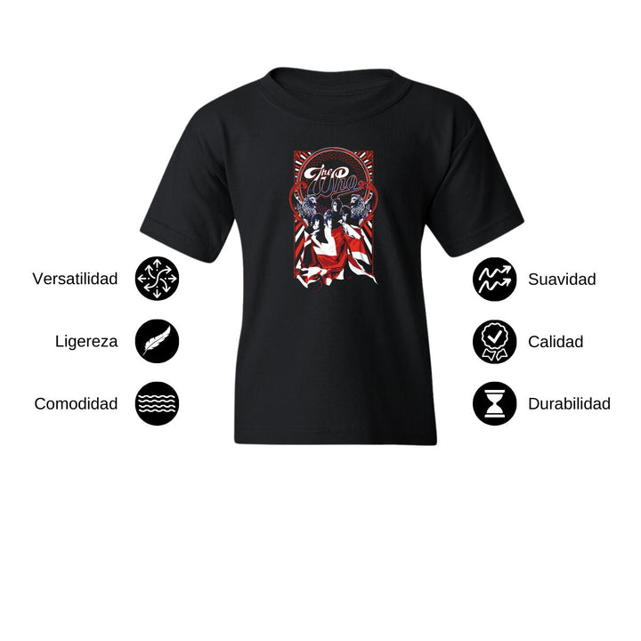Playera infantil manga corta, cuello redondo para niño o niña nueva, diseño The Who Ilustración Grupo original impreso con tecnología DTG (directo a la prenda) tacto cero, uso casual o deportiva, 100% algodón chifón pre encogido, estructura tubular sin costuras laterales. Colores de camiseta: Negro.