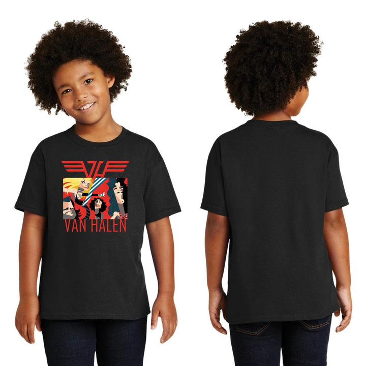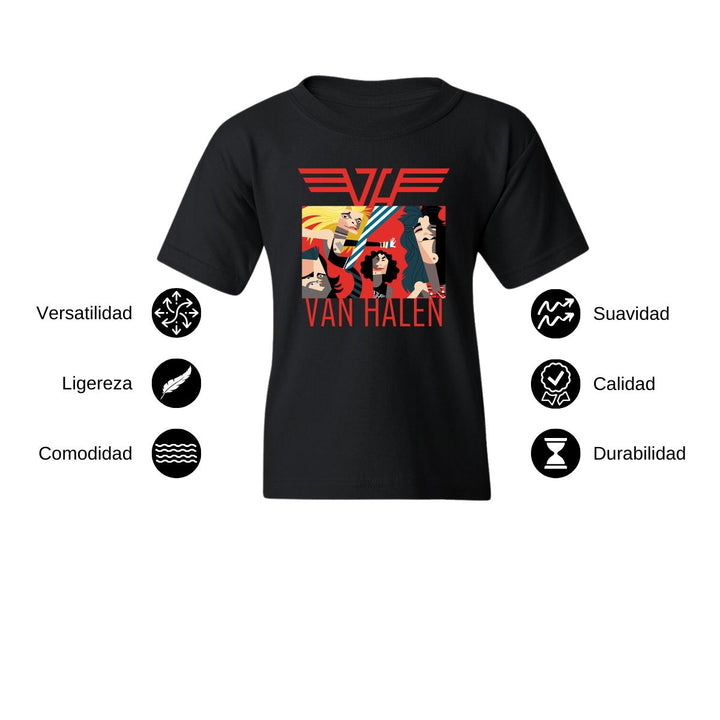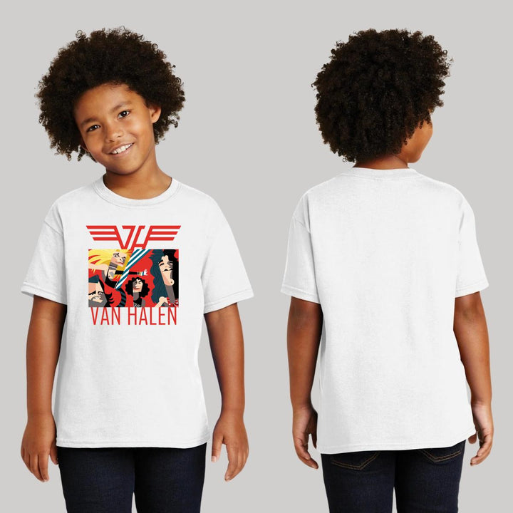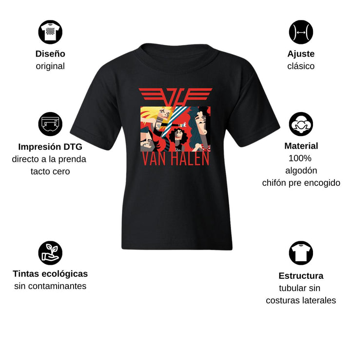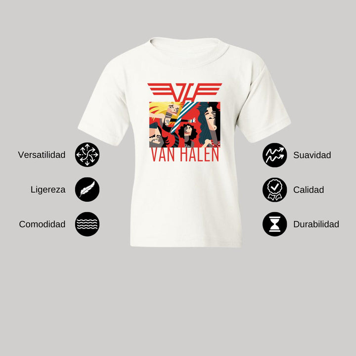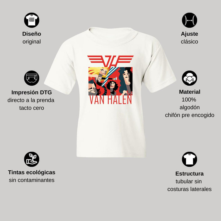 Playera infantil manga corta, cuello redondo para niño o niña nueva, diseño Van Halen Póster original impreso con tecnología DTG (directo a la prenda) tacto cero, uso casual o deportiva, 100% algodón chifón pre encogido, estructura tubular sin costuras laterales. Colores de camiseta: Blanco.