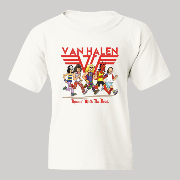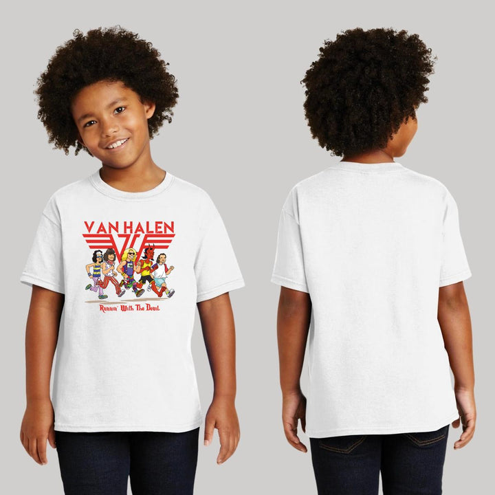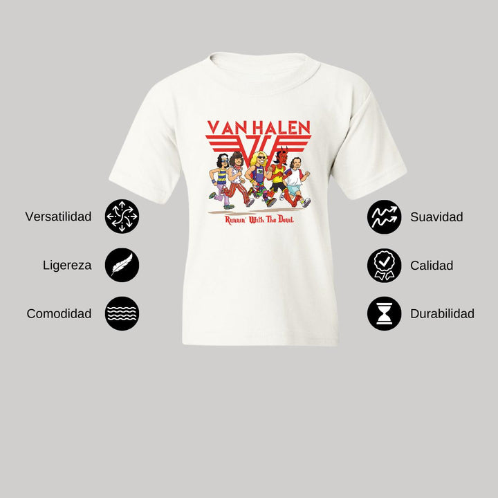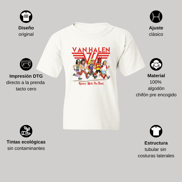 Playera infantil manga corta, cuello redondo para niño o niña nueva, diseño Van Halen Running with the devil original impreso con tecnología DTG (directo a la prenda) tacto cero, uso casual o deportiva, 100% algodón chifón pre encogido, estructura tubular sin costuras laterales. Colores de camiseta: Blanco.