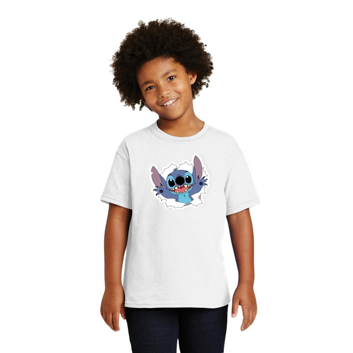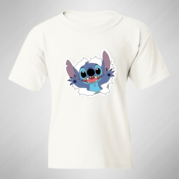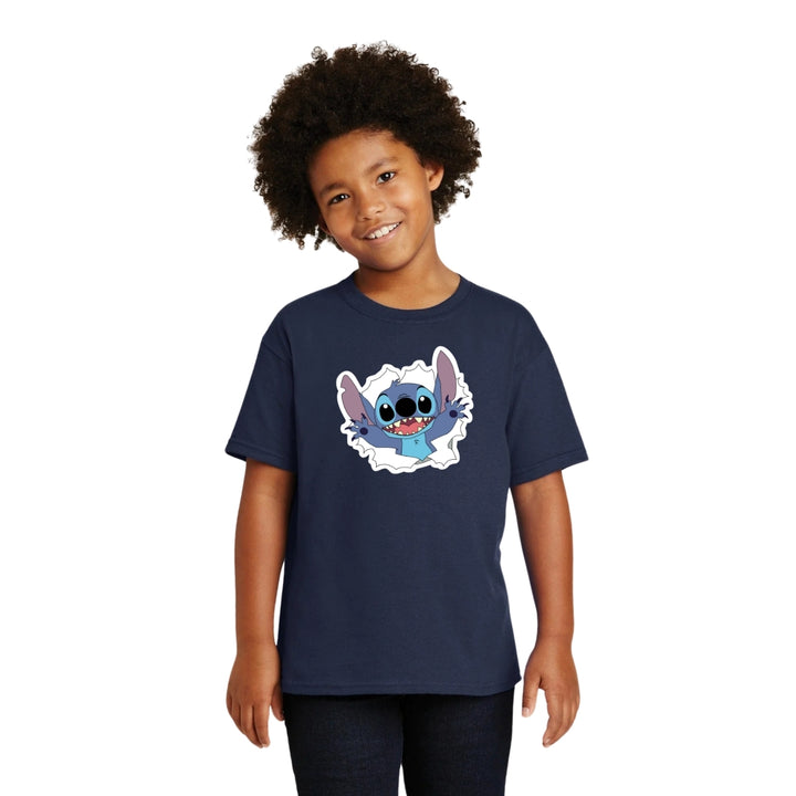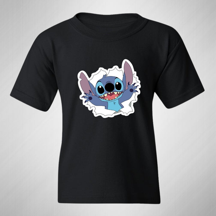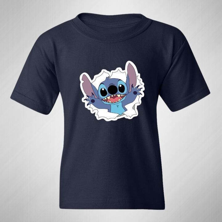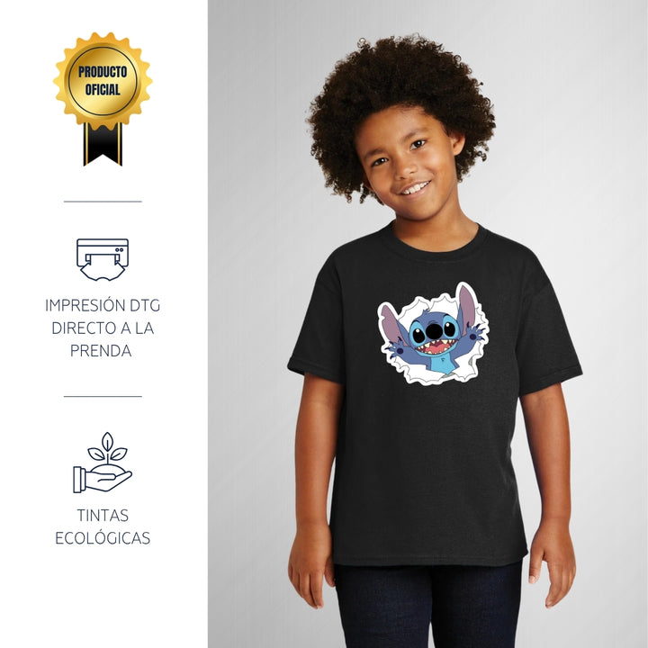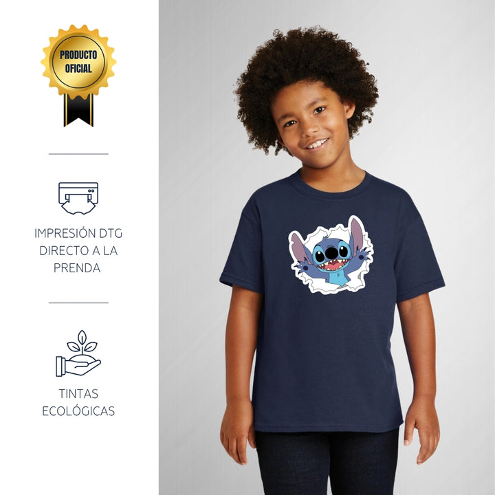 Playera infantil manga corta, cuello redondo para niño o niña nueva, diseño Stitch original impreso con tecnología DTG (directo a la prenda) tacto cero, uso casual o deportiva, 100% algodón chifón pre encogido, estructura tubular sin costuras laterales. Colores de camiseta: Azul Marino, Blanco, Negro.