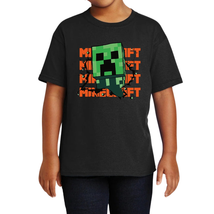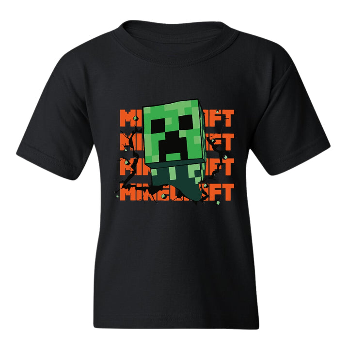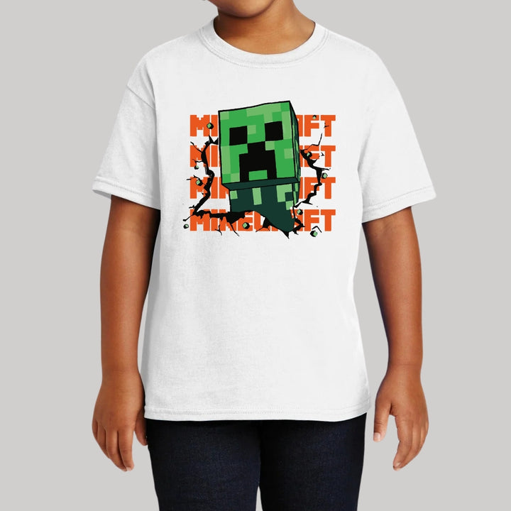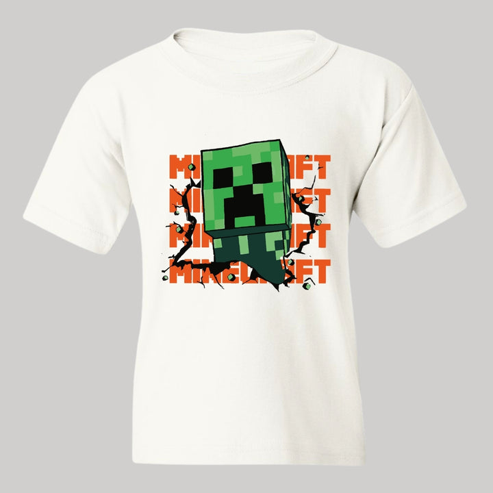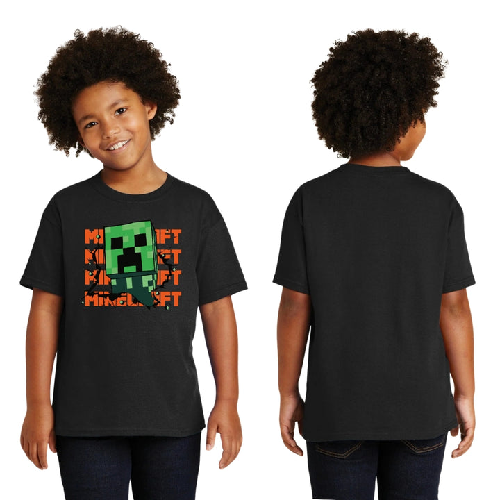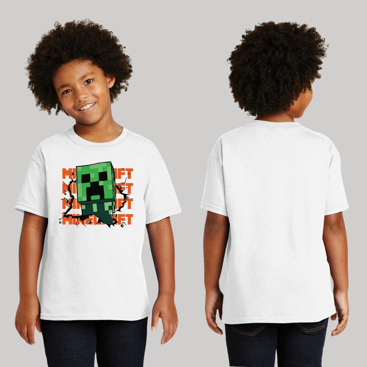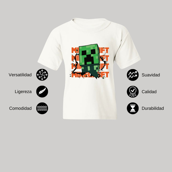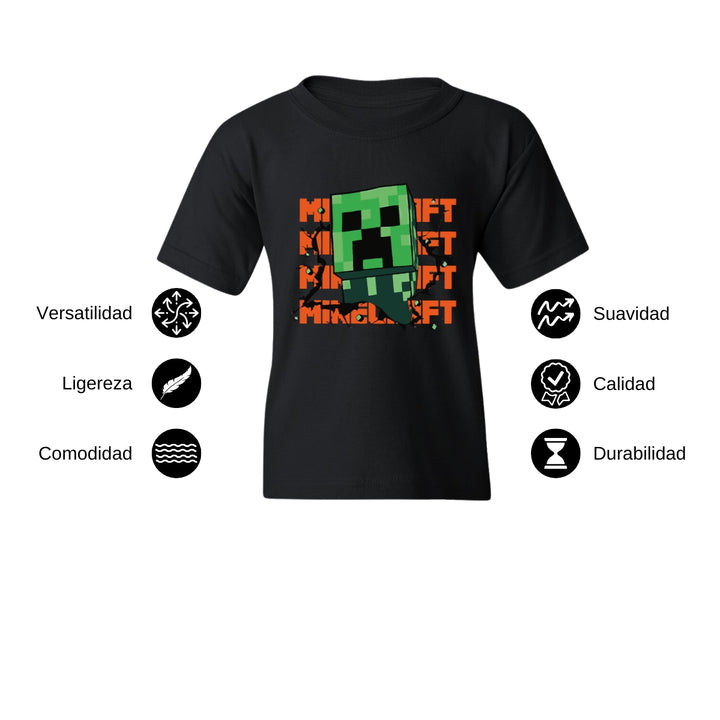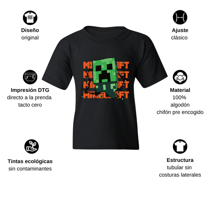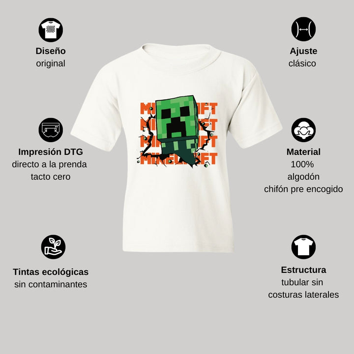 Playera infantil manga corta, cuello redondo para niño o niña nueva, diseño Video Juego Minecraft Creeper original impreso con tecnología DTG (directo a la prenda) tacto cero, uso casual o deportiva, 100% algodón chifón pre encogido, estructura tubular sin costuras laterales. Colores de camiseta: Negro, Blanco.