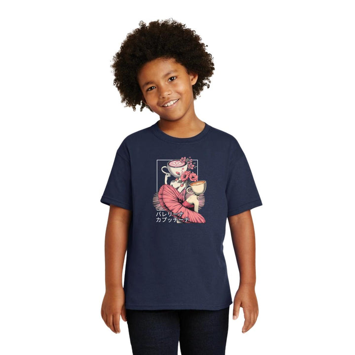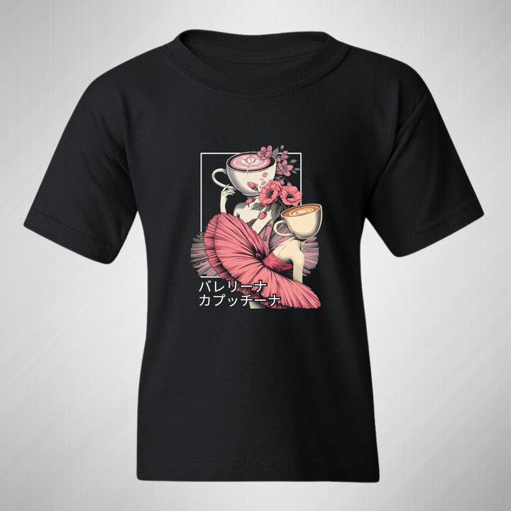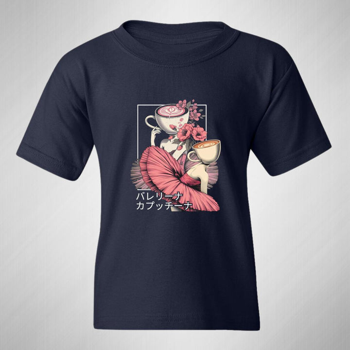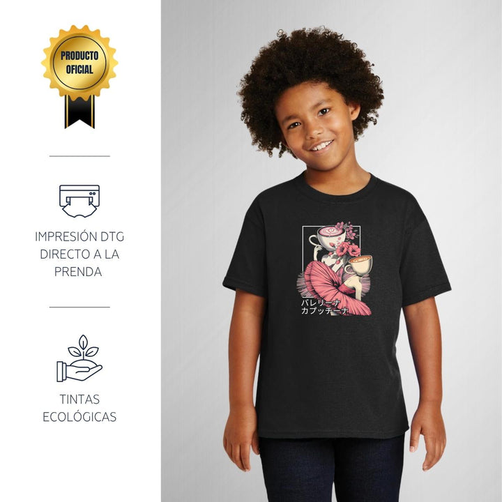 Playera infantil manga corta, cuello redondo para niño o niña nueva, diseño Brainrot Ballerina Capuchina original impreso con tecnología DTG (directo a la prenda) tacto cero, uso casual o deportiva, 100% algodón chifón pre encogido, estructura tubular sin costuras laterales. Colores de camiseta: Negro, Azul Marino.