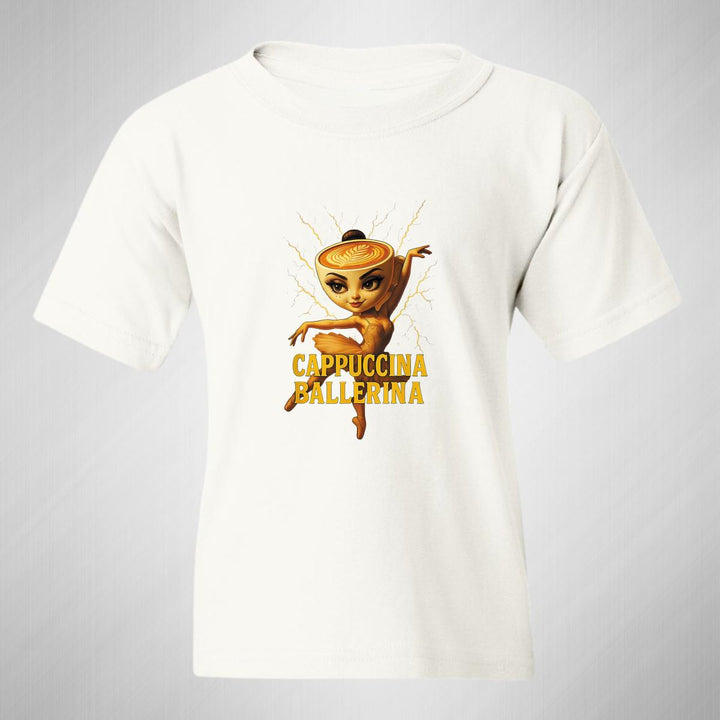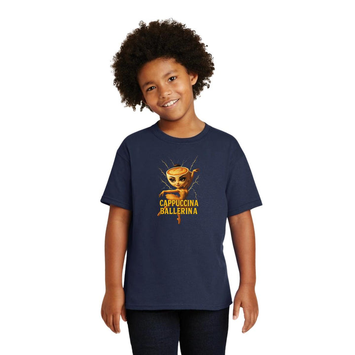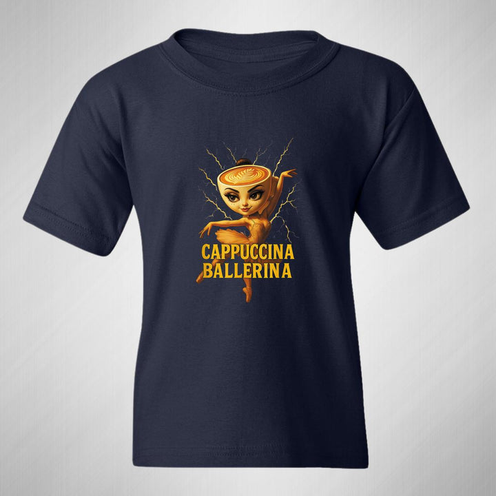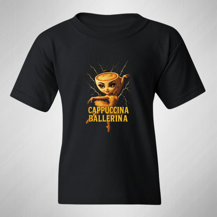 Playera infantil manga corta, cuello redondo para niño o niña nueva, diseño Brainrot Ballerina Capuchina original impreso con tecnología DTG (directo a la prenda) tacto cero, uso casual o deportiva, 100% algodón chifón pre encogido, estructura tubular sin costuras laterales. Colores de camiseta: Negro, Blanco, Azul Marino.