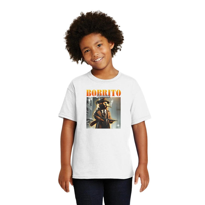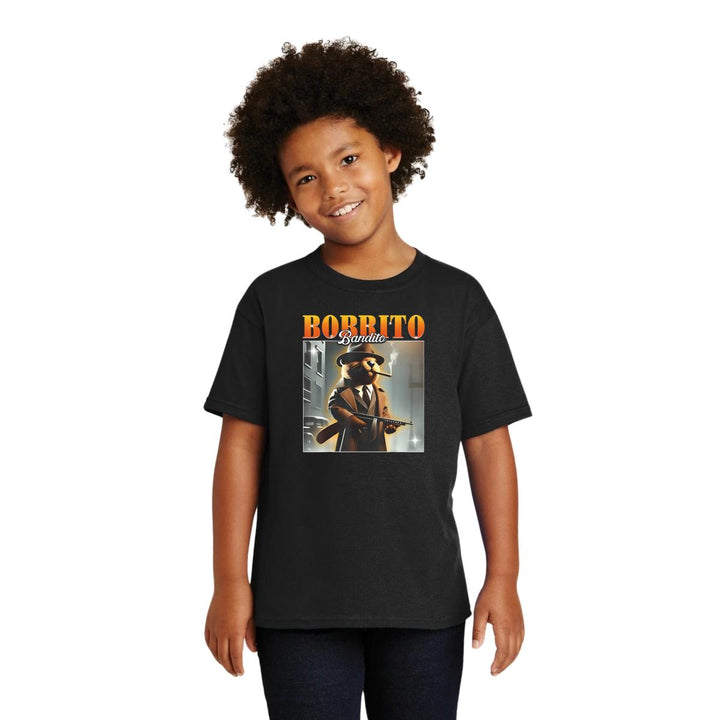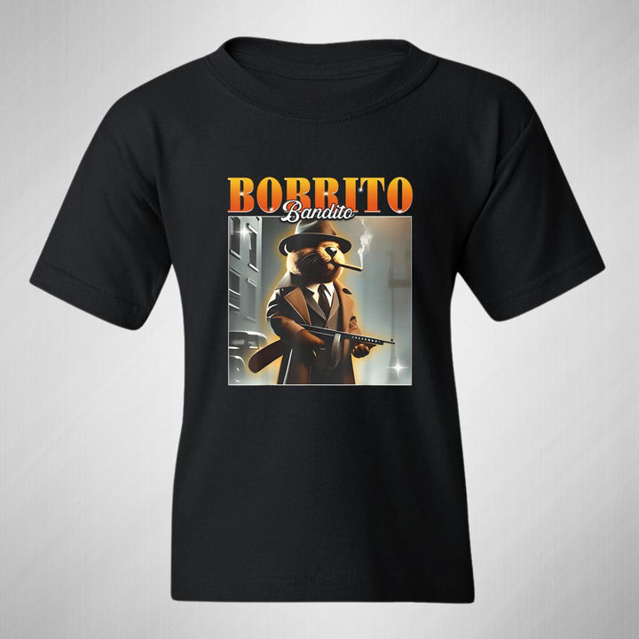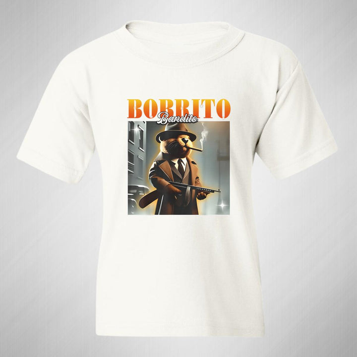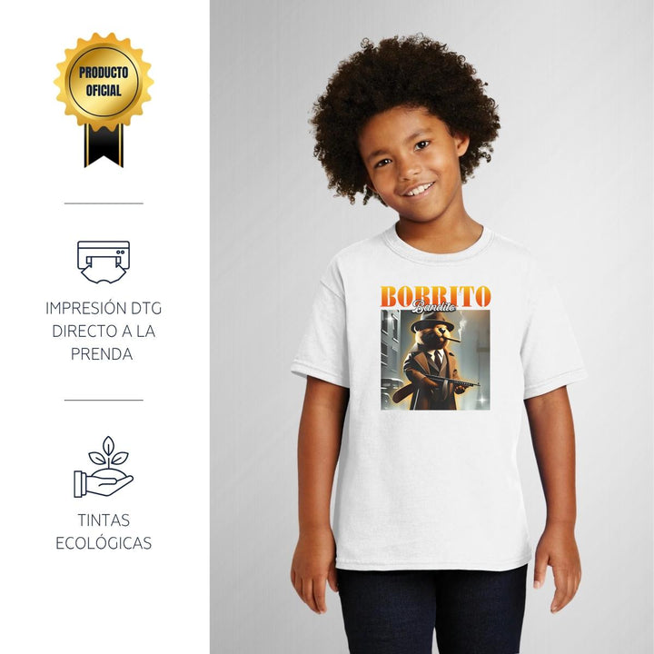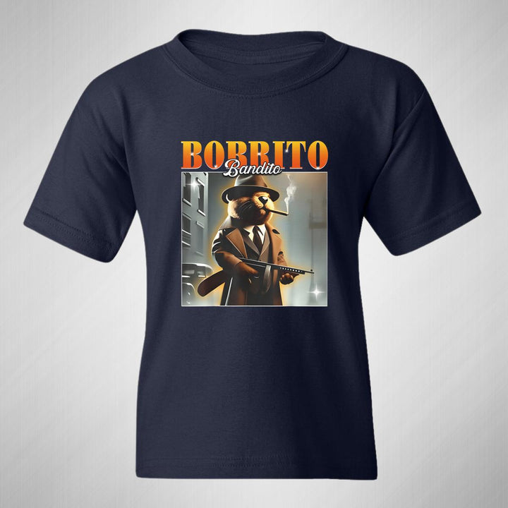 Playera infantil manga corta, cuello redondo para niño o niña nueva, diseño Brainrot Bobrito Bandito original impreso con tecnología DTG (directo a la prenda) tacto cero, uso casual o deportiva, 100% algodón chifón pre encogido, estructura tubular sin costuras laterales. Colores de camiseta: Negro, Blanco, Azul Marino.