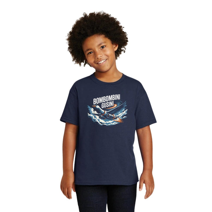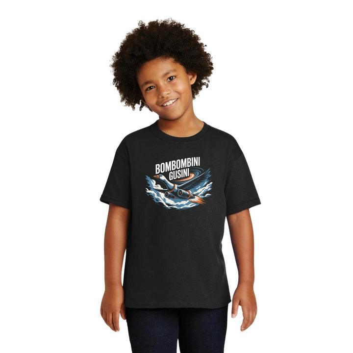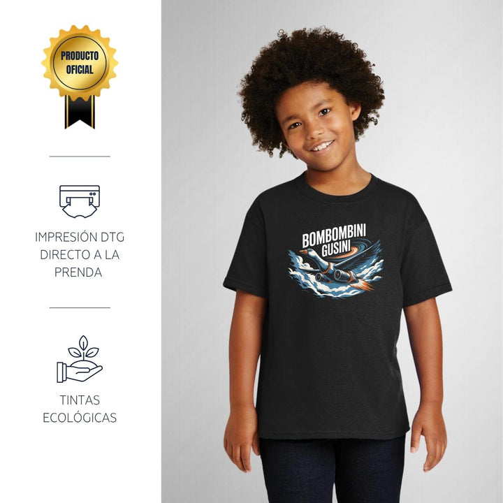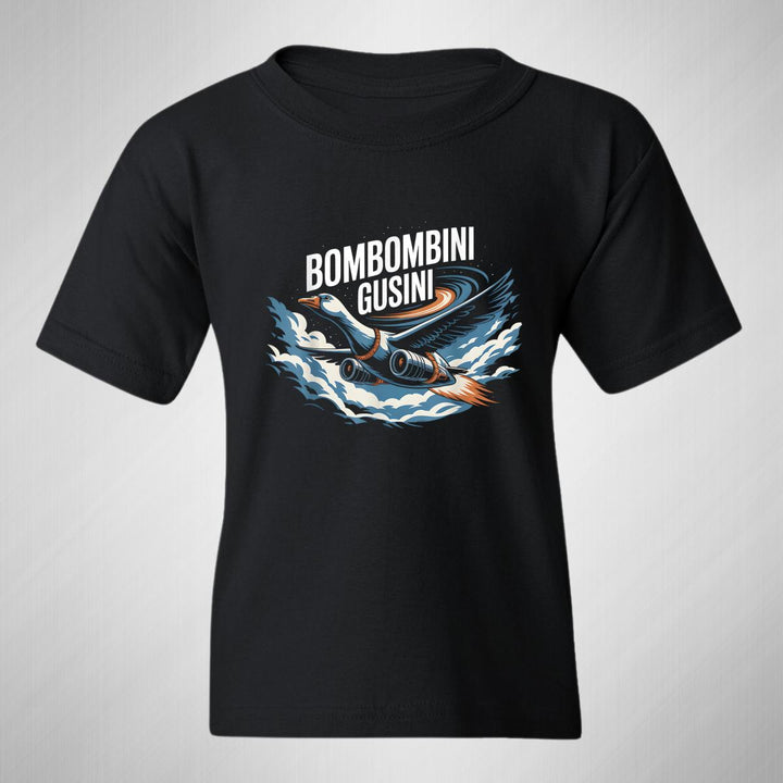 Playera infantil manga corta, cuello redondo para niño o niña nueva, diseño Brainrot Bombombini Gusini original impreso con tecnología DTG (directo a la prenda) tacto cero, uso casual o deportiva, 100% algodón chifón pre encogido, estructura tubular sin costuras laterales. Colores de camiseta: Negro, Blanco, Azul Marino.