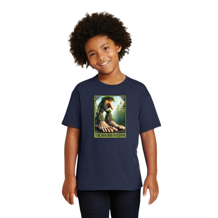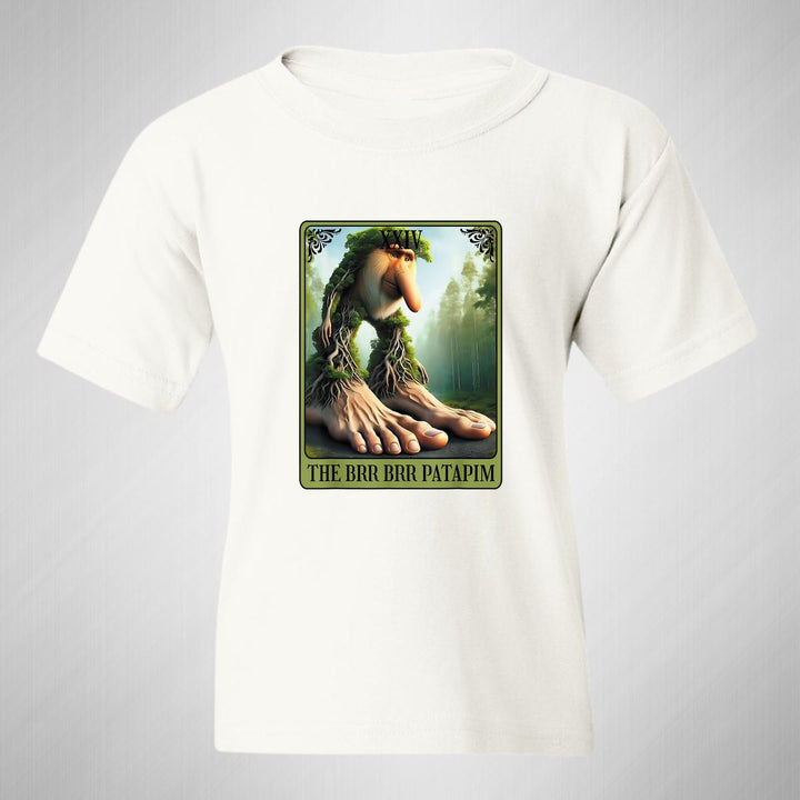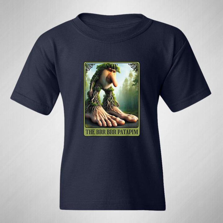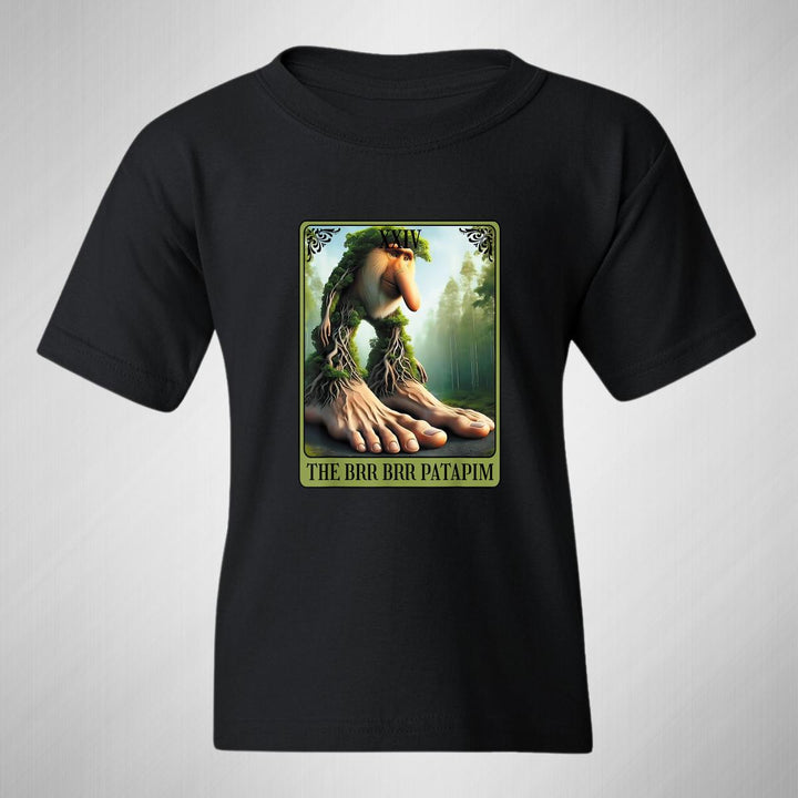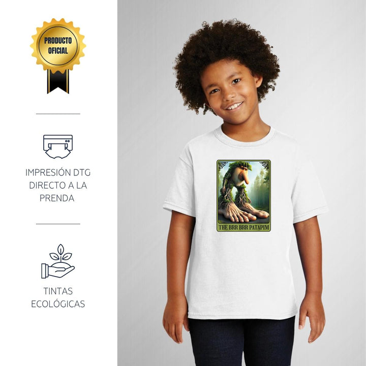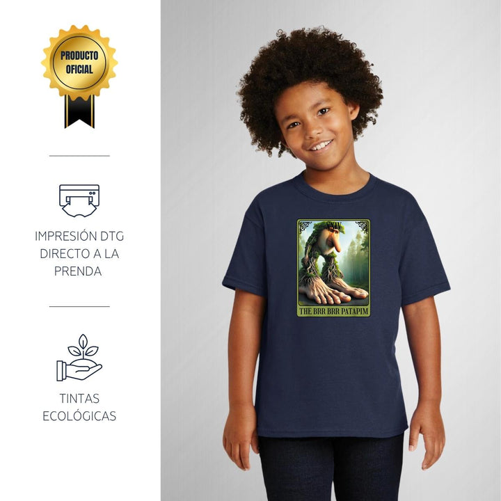 Playera infantil manga corta, cuello redondo para niño o niña nueva, diseño Brainrot Brr Brr Patapim original impreso con tecnología DTG (directo a la prenda) tacto cero, uso casual o deportiva, 100% algodón chifón pre encogido, estructura tubular sin costuras laterales. Colores de camiseta: Negro, Blanco, Azul Marino.