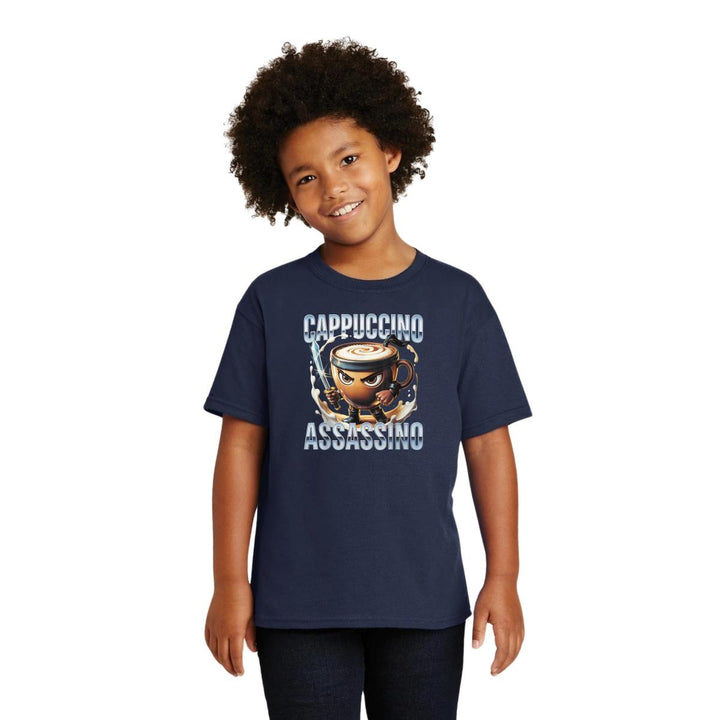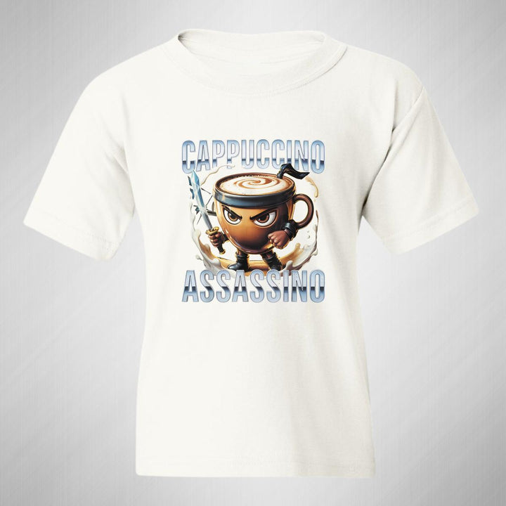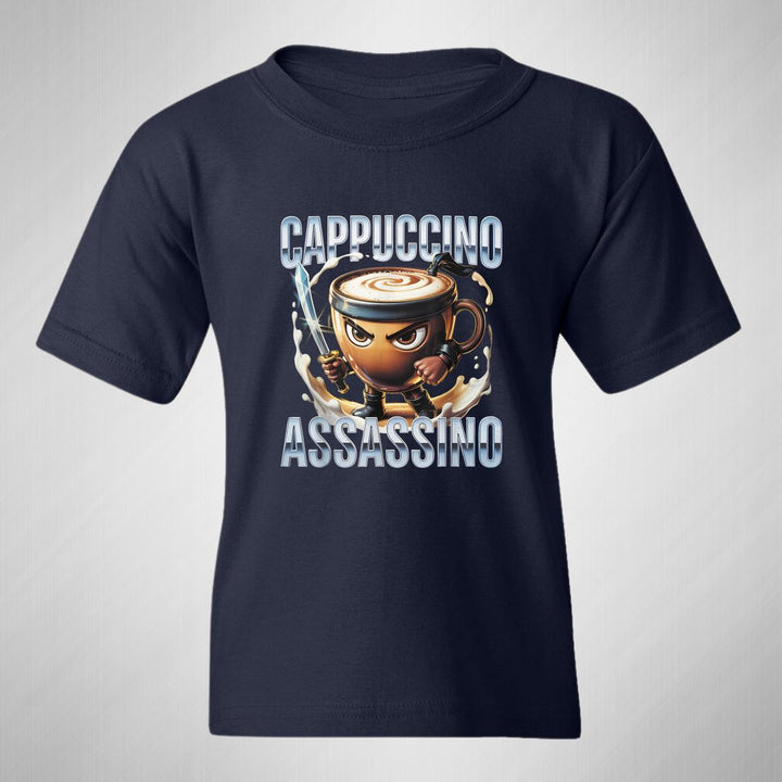 Playera infantil manga corta, cuello redondo para niño o niña nueva, diseño Brainrot Cappuccino Assassino original impreso con tecnología DTG (directo a la prenda) tacto cero, uso casual o deportiva, 100% algodón chifón pre encogido, estructura tubular sin costuras laterales. Colores de camiseta: Negro, Blanco, Azul Marino.