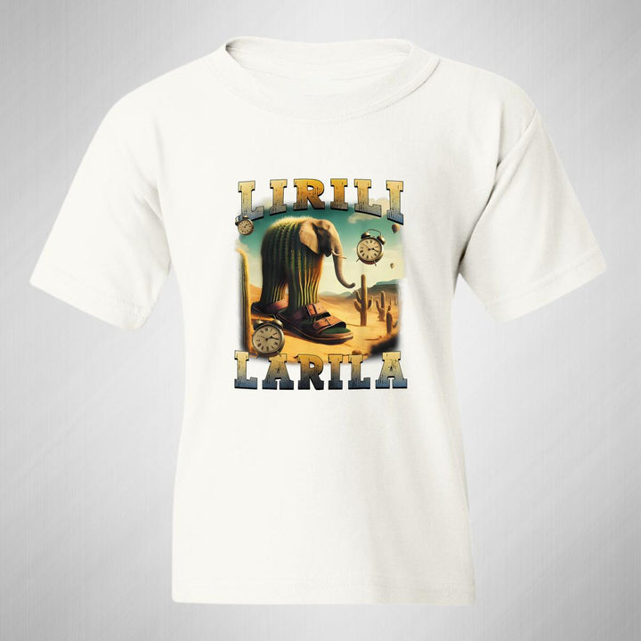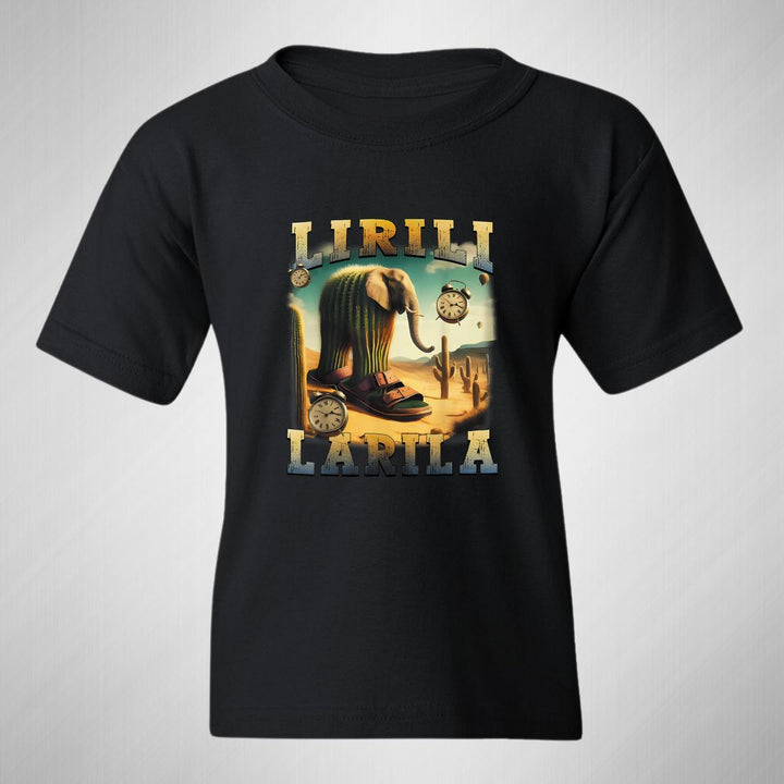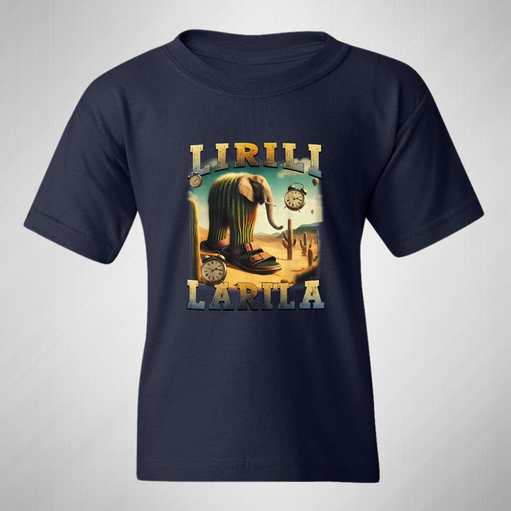 Playera infantil manga corta, cuello redondo para niño o niña nueva, diseño Brainrot Lirili Larila original impreso con tecnología DTG (directo a la prenda) tacto cero, uso casual o deportiva, 100% algodón chifón pre encogido, estructura tubular sin costuras laterales. Colores de camiseta: Negro, Blanco, Azul Marino.