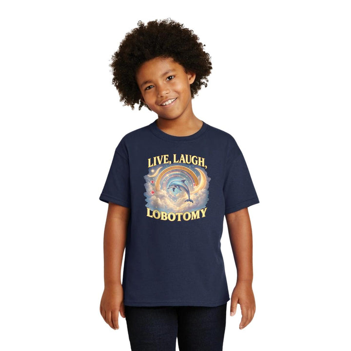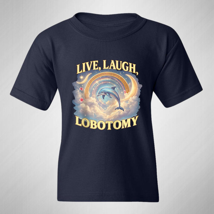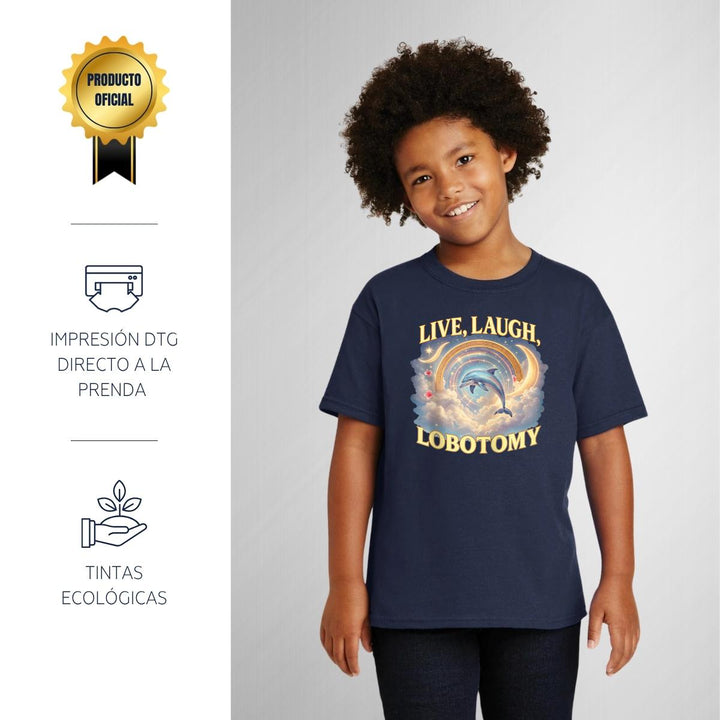 Playera infantil manga corta, cuello redondo para niño o niña nueva, diseño Brainrot Live Laugh Lobotomy original impreso con tecnología DTG (directo a la prenda) tacto cero, uso casual o deportiva, 100% algodón chifón pre encogido, estructura tubular sin costuras laterales. Colores de camiseta: Negro, Blanco, Azul Marino.