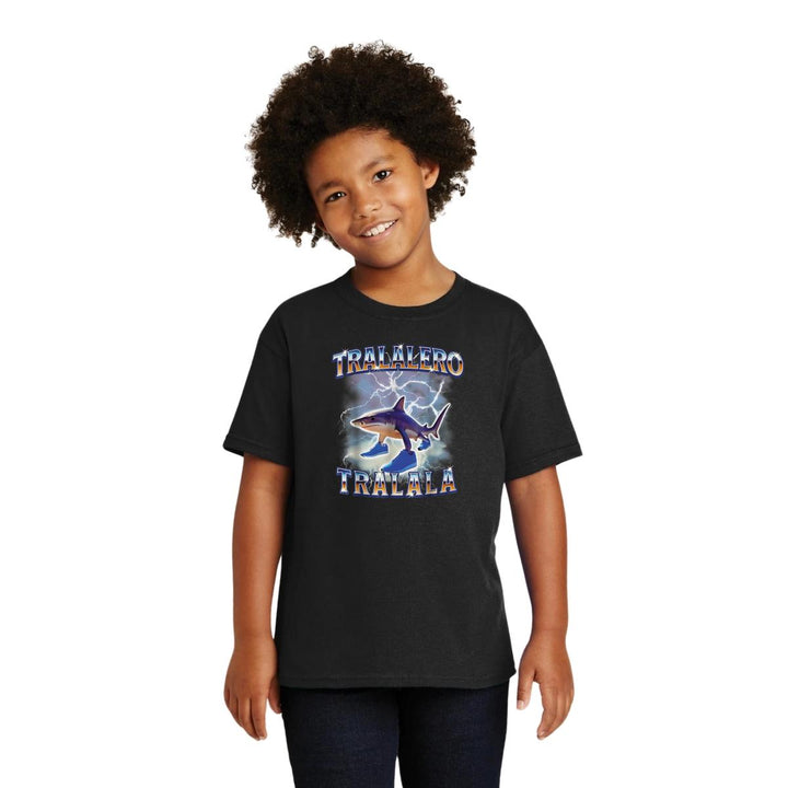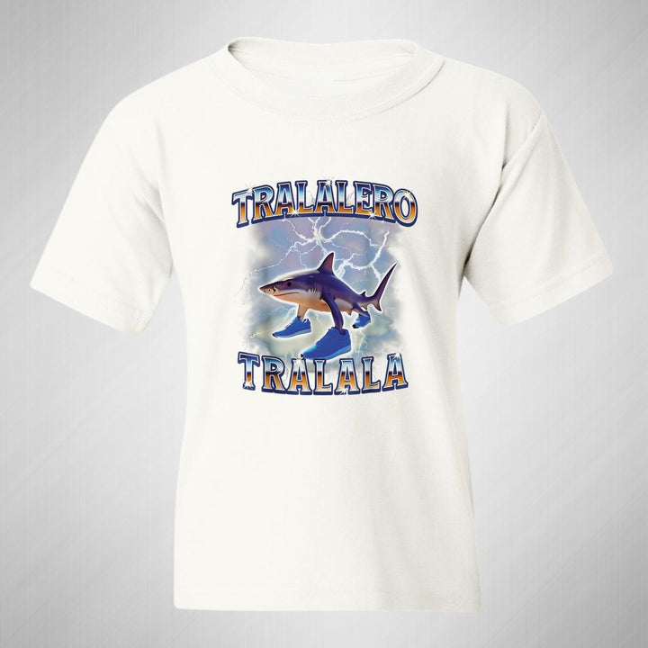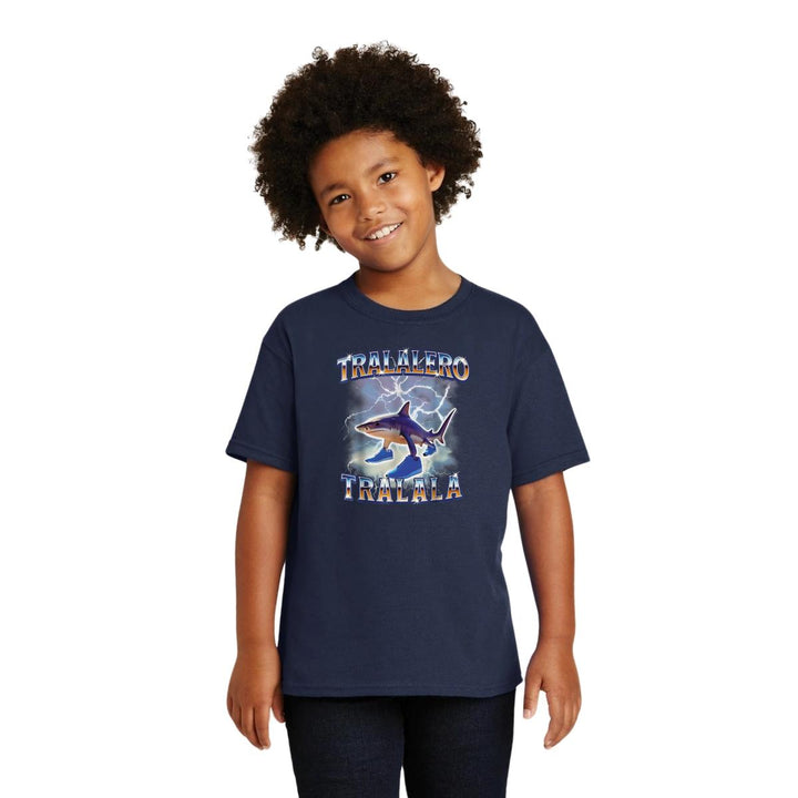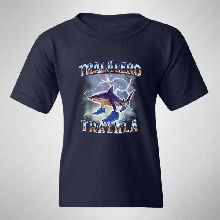 Playera infantil manga corta, cuello redondo para niño o niña nueva, diseño Brainrot Tralalero Tralala original impreso con tecnología DTG (directo a la prenda) tacto cero, uso casual o deportiva, 100% algodón chifón pre encogido, estructura tubular sin costuras laterales. Colores de camiseta: Negro, Blanco, Azul Marino.