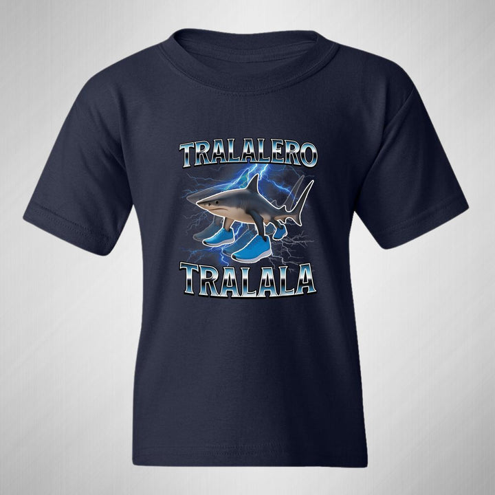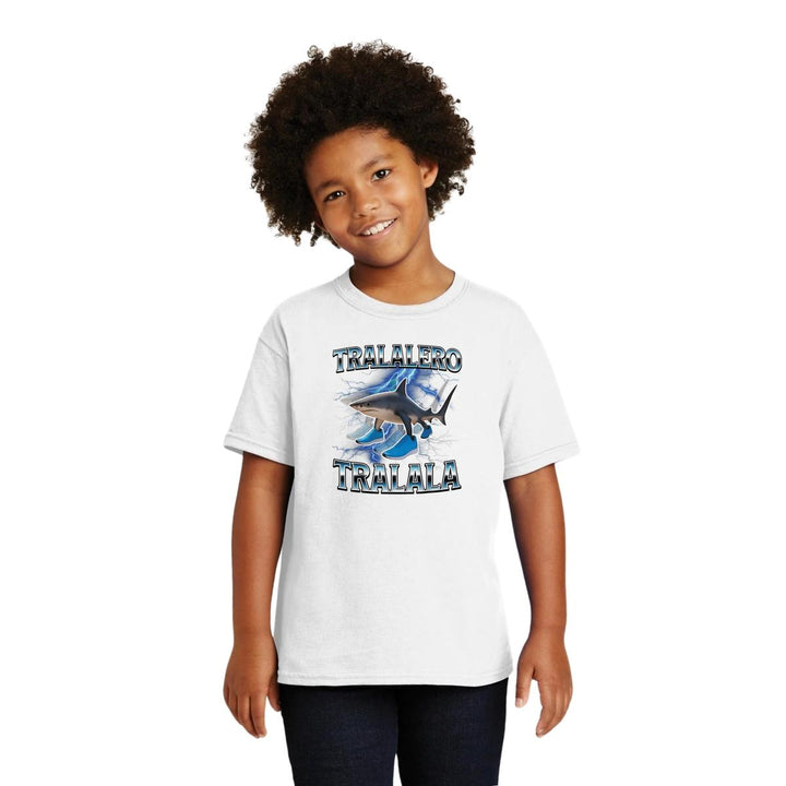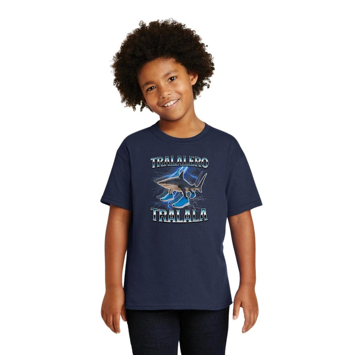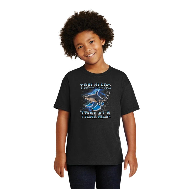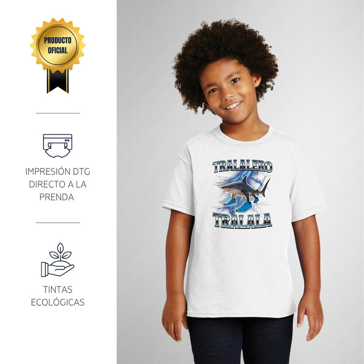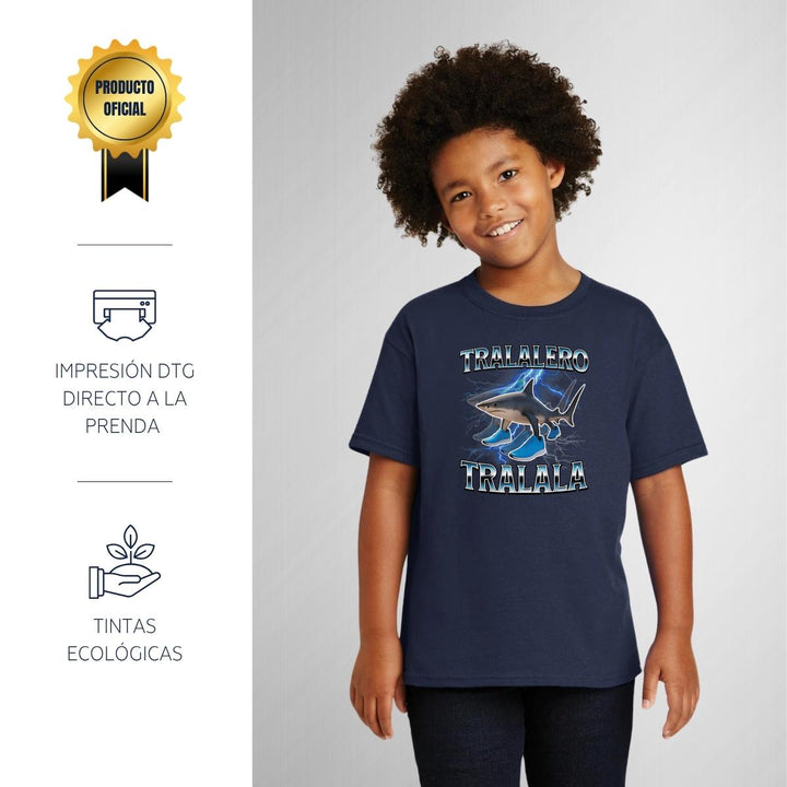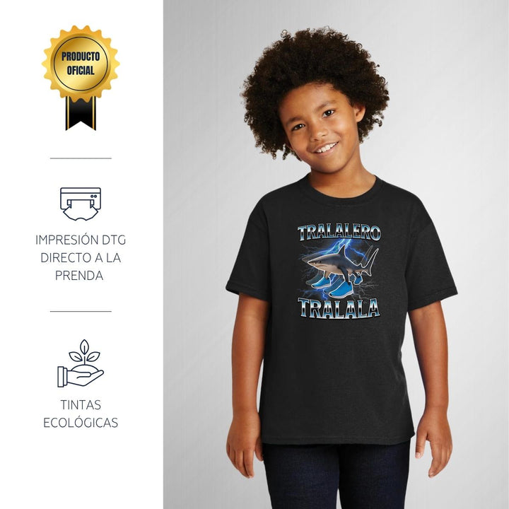 Playera infantil manga corta, cuello redondo para niño o niña nueva, diseño Brainrot Tralalero Tralala original impreso con tecnología DTG (directo a la prenda) tacto cero, uso casual o deportiva, 100% algodón chifón pre encogido, estructura tubular sin costuras laterales. Colores de camiseta: Negro, Blanco, Azul Marino.