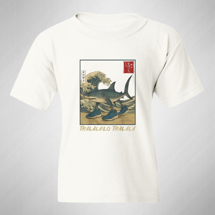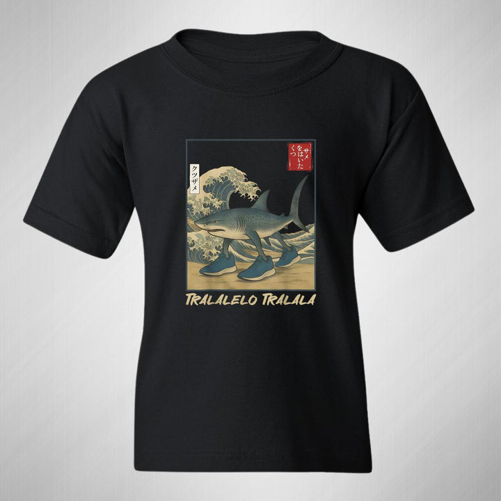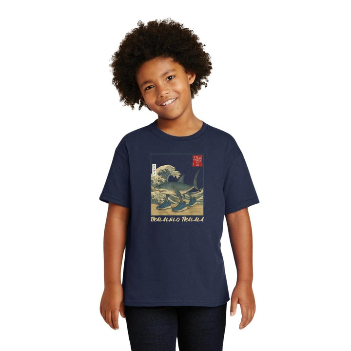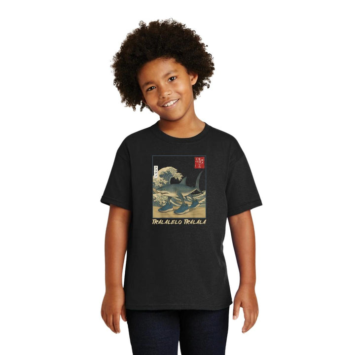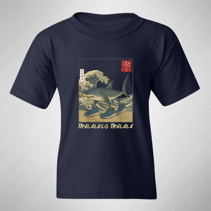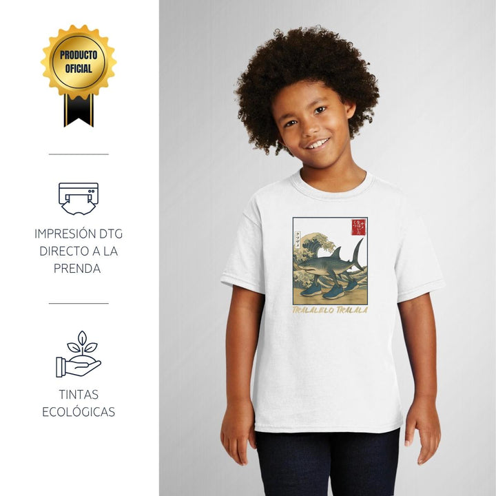 Playera infantil manga corta, cuello redondo para niño o niña nueva, diseño Brainrot Tralalero Tralala original impreso con tecnología DTG (directo a la prenda) tacto cero, uso casual o deportiva, 100% algodón chifón pre encogido, estructura tubular sin costuras laterales. Colores de camiseta: Negro, Blanco, Azul Marino.