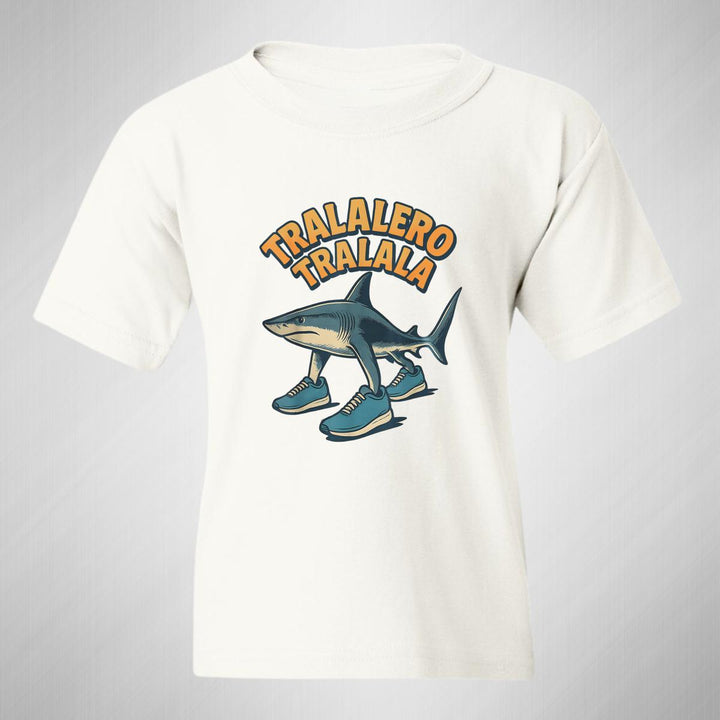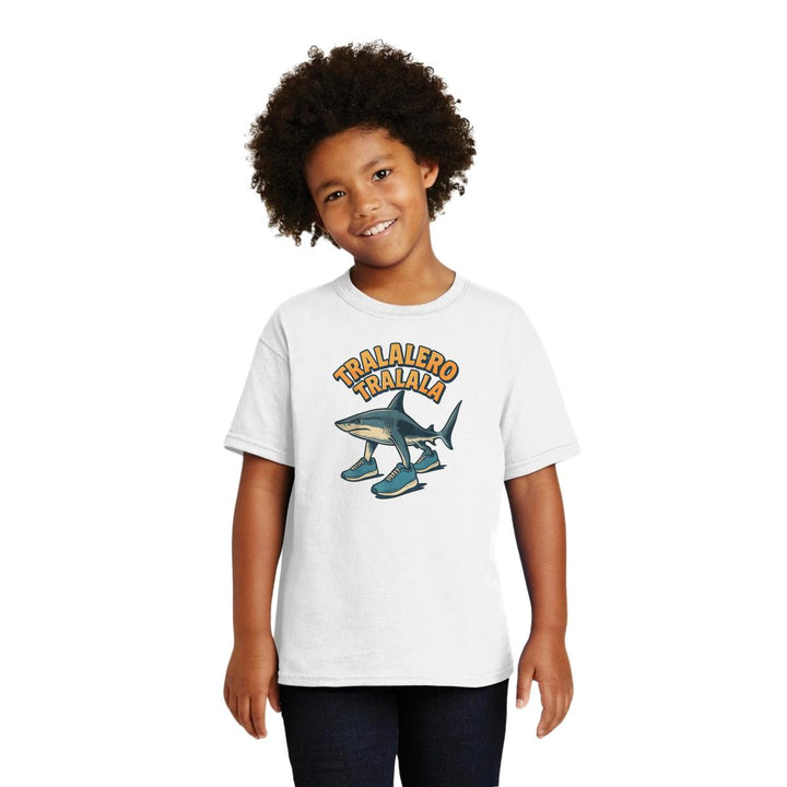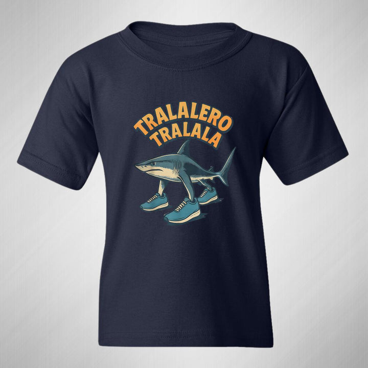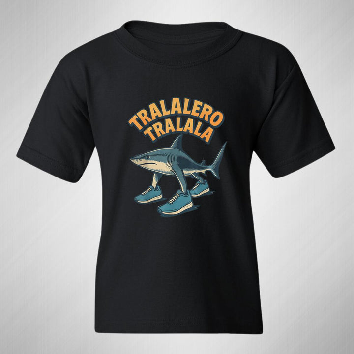 Playera infantil manga corta, cuello redondo para niño o niña nueva, diseño Brainrot Tralalero Tralala original impreso con tecnología DTG (directo a la prenda) tacto cero, uso casual o deportiva, 100% algodón chifón pre encogido, estructura tubular sin costuras laterales. Colores de camiseta: Negro, Blanco, Azul Marino.