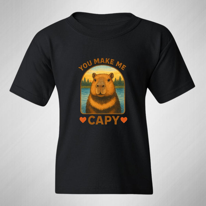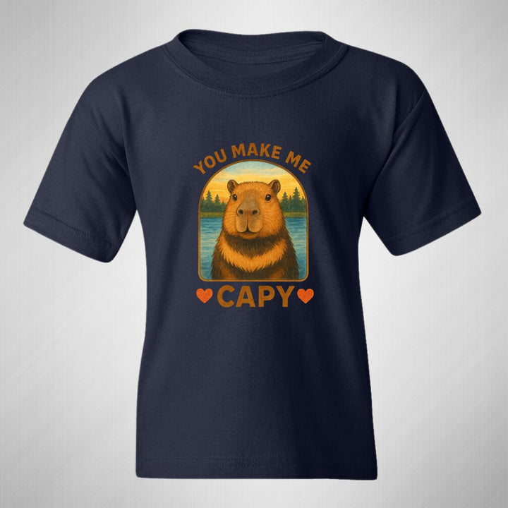 Playera infantil manga corta, cuello redondo para niño o niña nueva, diseño Capibara Carpincho Frases original impreso con tecnología DTG (directo a la prenda) tacto cero, uso casual o deportiva, 100% algodón chifón pre encogido, estructura tubular sin costuras laterales. Colores de camiseta: Negro, Blanco, Azul Marino.