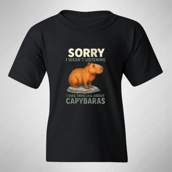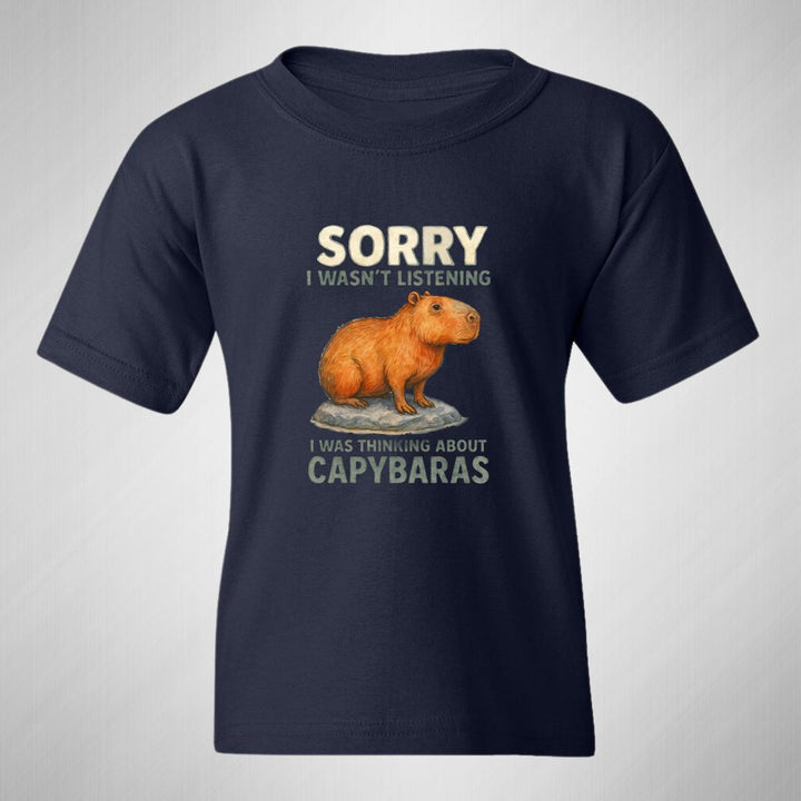 Playera infantil manga corta, cuello redondo para niño o niña nueva, diseño Capibara Carpincho Frases original impreso con tecnología DTG (directo a la prenda) tacto cero, uso casual o deportiva, 100% algodón chifón pre encogido, estructura tubular sin costuras laterales. Colores de camiseta: Negro, Blanco, Azul Marino.