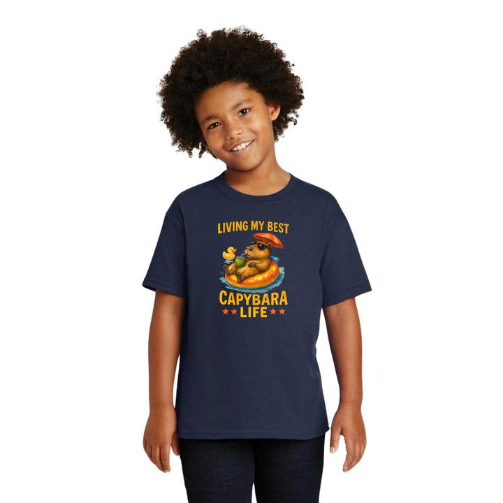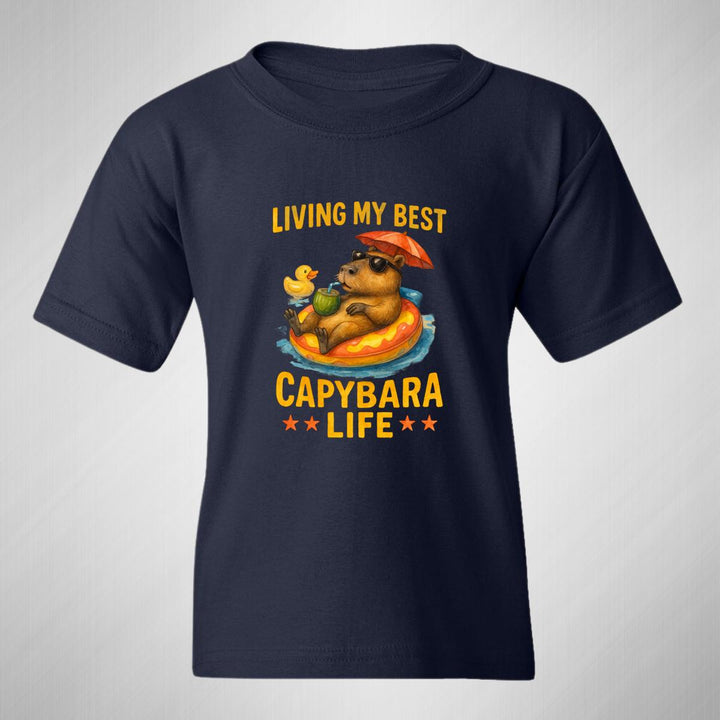 Playera infantil manga corta, cuello redondo para niño o niña nueva, diseño Capibara Carpincho Frases original impreso con tecnología DTG (directo a la prenda) tacto cero, uso casual o deportiva, 100% algodón chifón pre encogido, estructura tubular sin costuras laterales. Colores de camiseta: Negro, Blanco, Azul Marino.