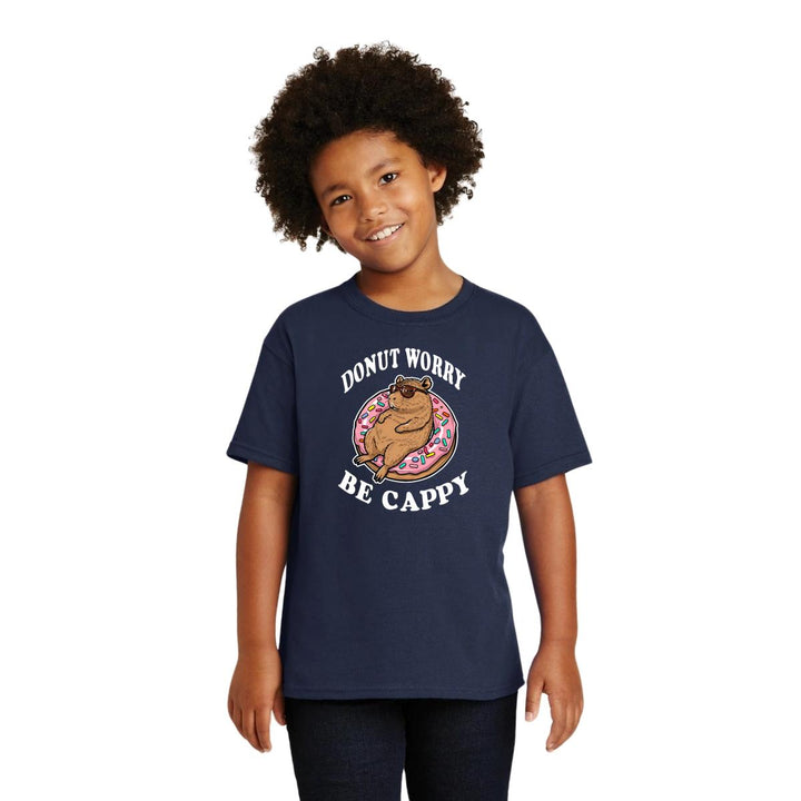 Playera infantil manga corta, cuello redondo para niño o niña nueva, diseño Capibara Carpincho Frases original impreso con tecnología DTG (directo a la prenda) tacto cero, uso casual o deportiva, 100% algodón chifón pre encogido, estructura tubular sin costuras laterales. Colores de camiseta: Negro, Azul Marino.