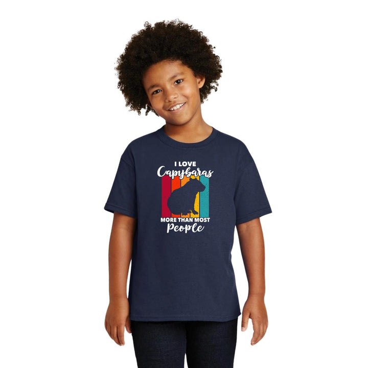 Playera infantil manga corta, cuello redondo para niño o niña nueva, diseño Capibara Carpincho Frases original impreso con tecnología DTG (directo a la prenda) tacto cero, uso casual o deportiva, 100% algodón chifón pre encogido, estructura tubular sin costuras laterales. Colores de camiseta: Negro, Azul Marino.