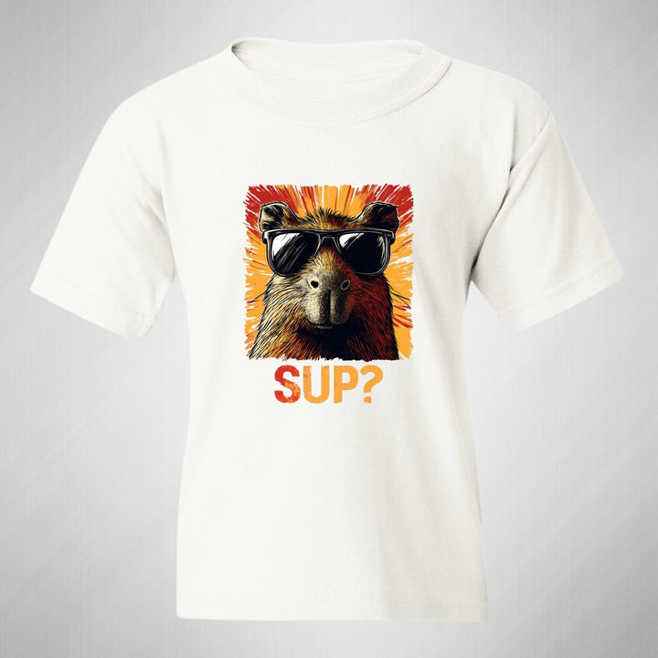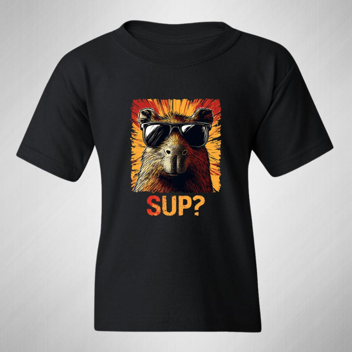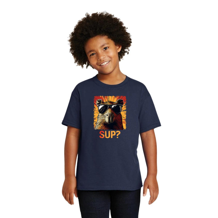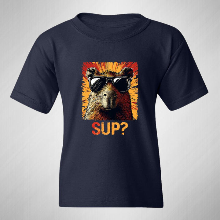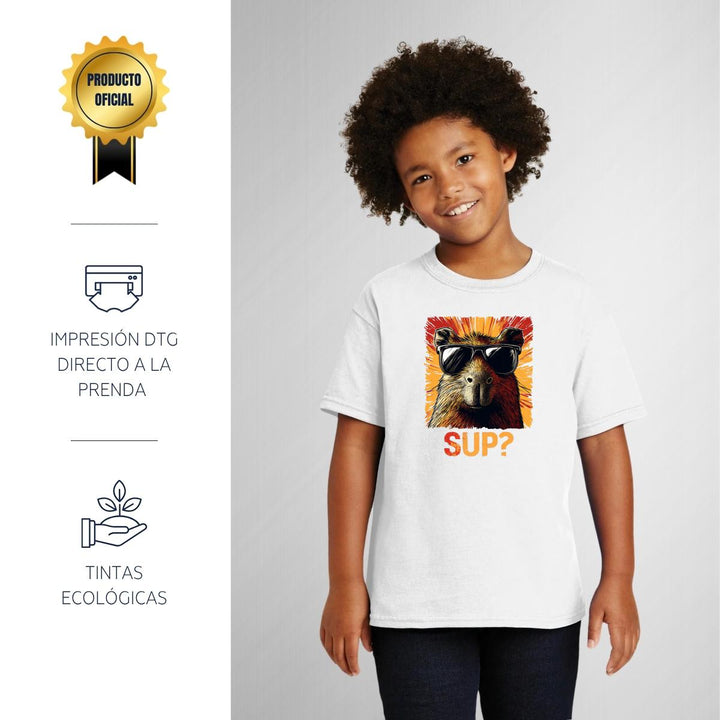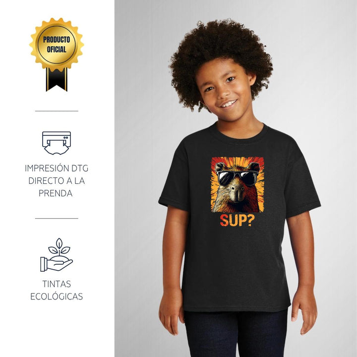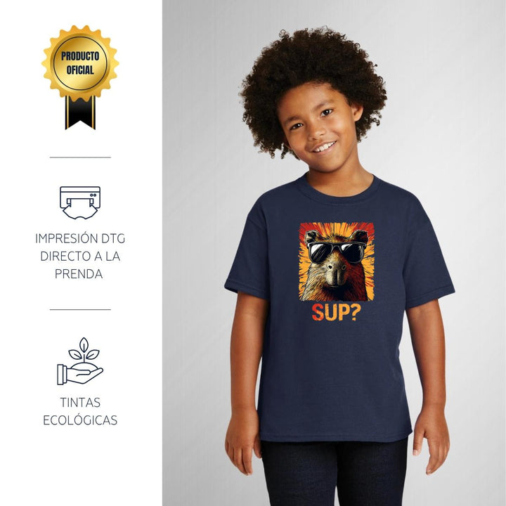 Playera infantil manga corta, cuello redondo para niño o niña nueva, diseño Capibara Carpincho Frases original impreso con tecnología DTG (directo a la prenda) tacto cero, uso casual o deportiva, 100% algodón chifón pre encogido, estructura tubular sin costuras laterales. Colores de camiseta: Negro, Blanco, Azul Marino.