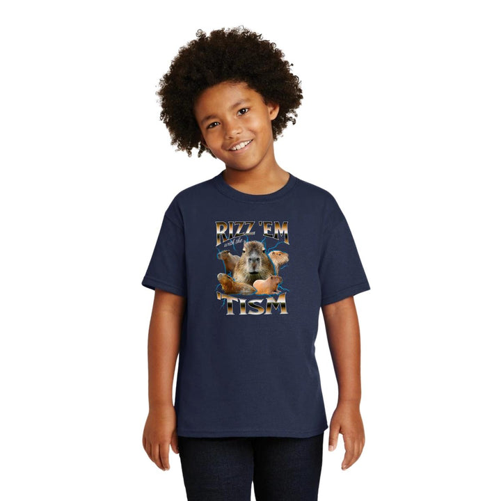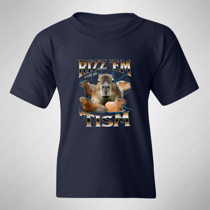 Playera infantil manga corta, cuello redondo para niño o niña nueva, diseño Capibara Carpincho Frases original impreso con tecnología DTG (directo a la prenda) tacto cero, uso casual o deportiva, 100% algodón chifón pre encogido, estructura tubular sin costuras laterales. Colores de camiseta: Negro, Azul Marino.