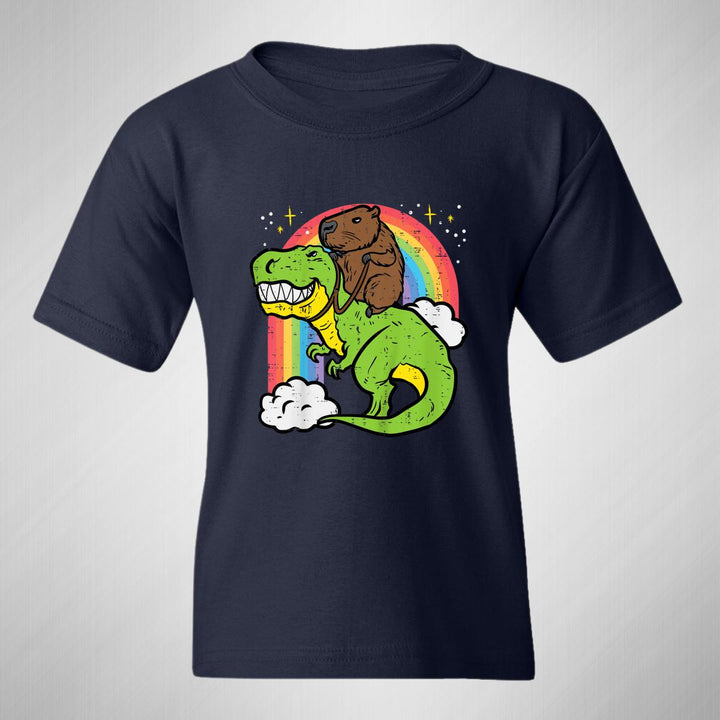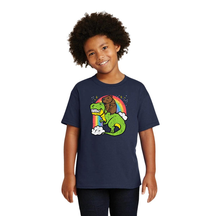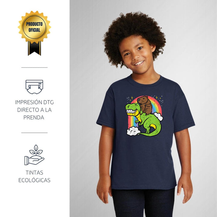 Playera infantil manga corta, cuello redondo para niño o niña nueva, diseño Capibara Carpincho Frases original impreso con tecnología DTG (directo a la prenda) tacto cero, uso casual o deportiva, 100% algodón chifón pre encogido, estructura tubular sin costuras laterales. Colores de camiseta: Negro, Azul Marino.