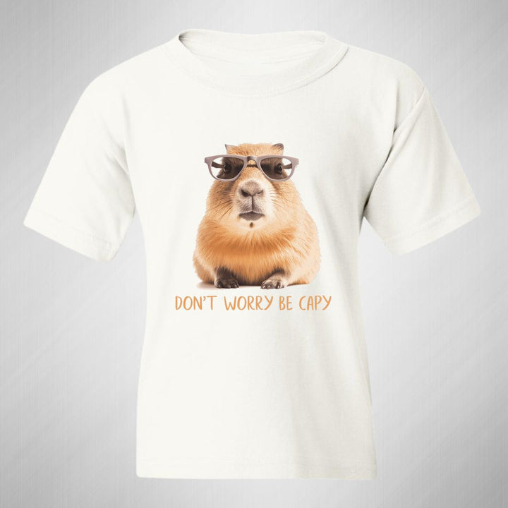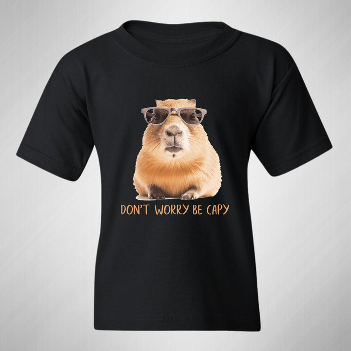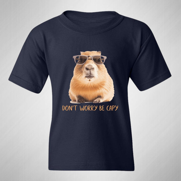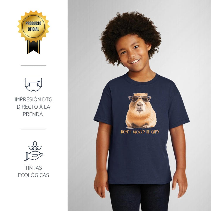 Playera infantil manga corta, cuello redondo para niño o niña nueva, diseño Capibara Carpincho Frases original impreso con tecnología DTG (directo a la prenda) tacto cero, uso casual o deportiva, 100% algodón chifón pre encogido, estructura tubular sin costuras laterales. Colores de camiseta: Negro, Blanco, Azul Marino.