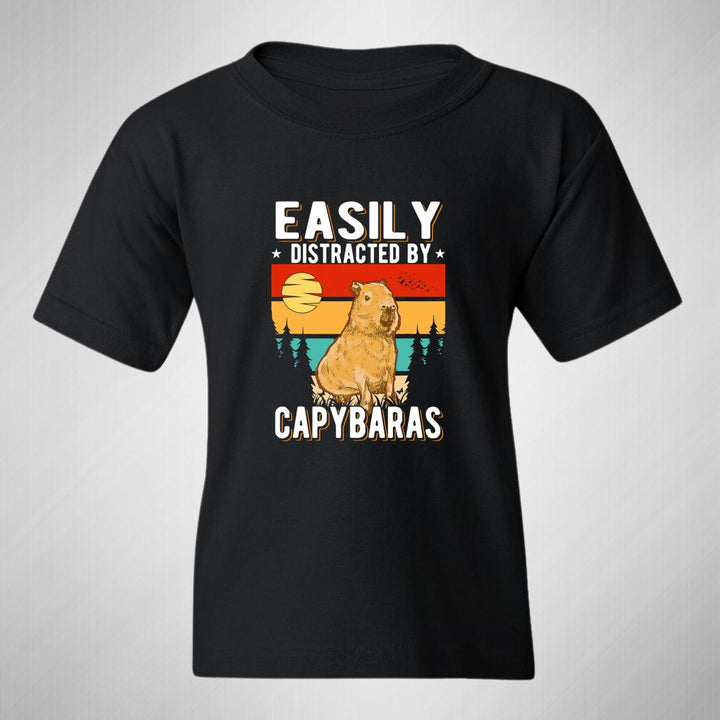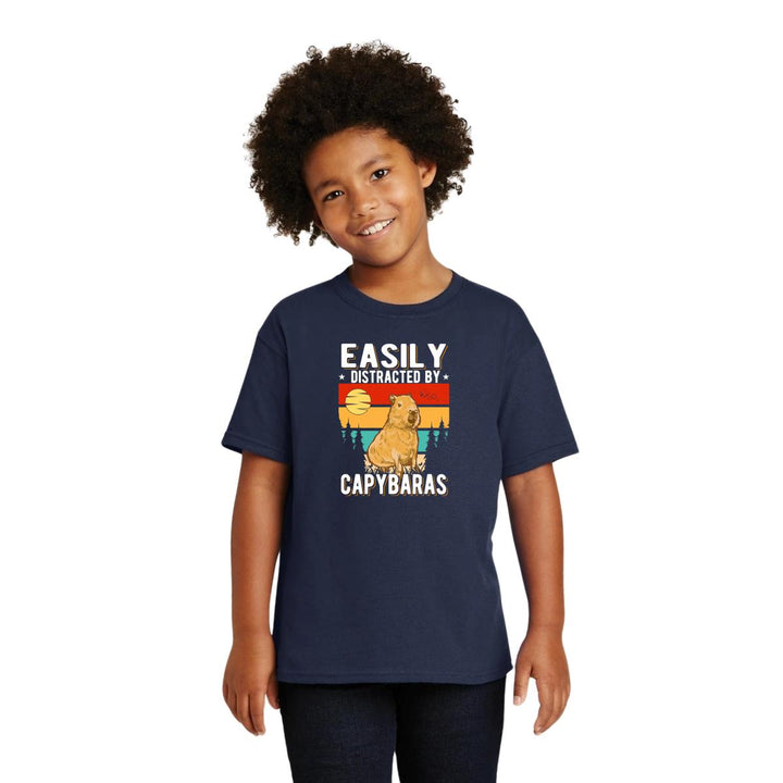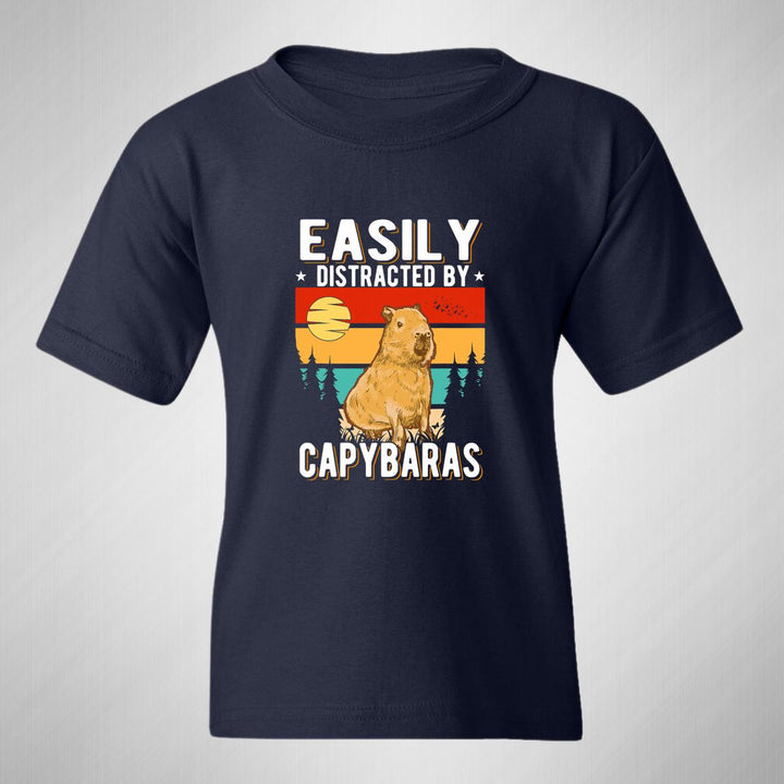 Playera infantil manga corta, cuello redondo para niño o niña nueva, diseño Capibara Carpincho Frases original impreso con tecnología DTG (directo a la prenda) tacto cero, uso casual o deportiva, 100% algodón chifón pre encogido, estructura tubular sin costuras laterales. Colores de camiseta: Negro, Azul Marino.