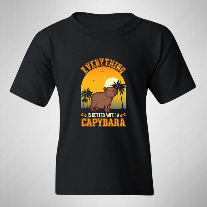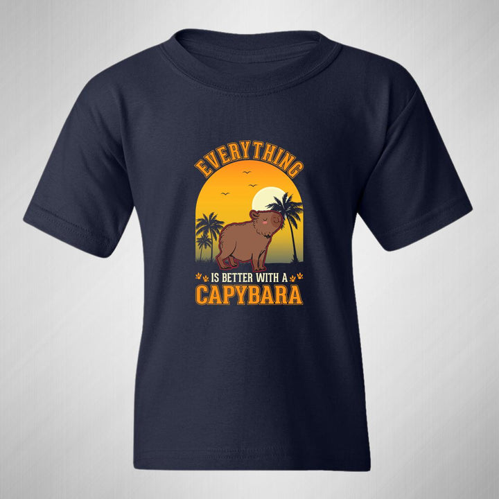Playera infantil manga corta, cuello redondo para niño o niña nueva, diseño Capibara Carpincho Frases original impreso con tecnología DTG (directo a la prenda) tacto cero, uso casual o deportiva, 100% algodón chifón pre encogido, estructura tubular sin costuras laterales. Colores de camiseta: Negro, Azul Marino.