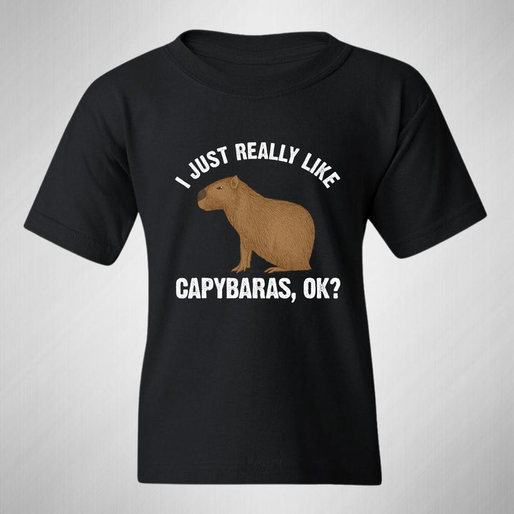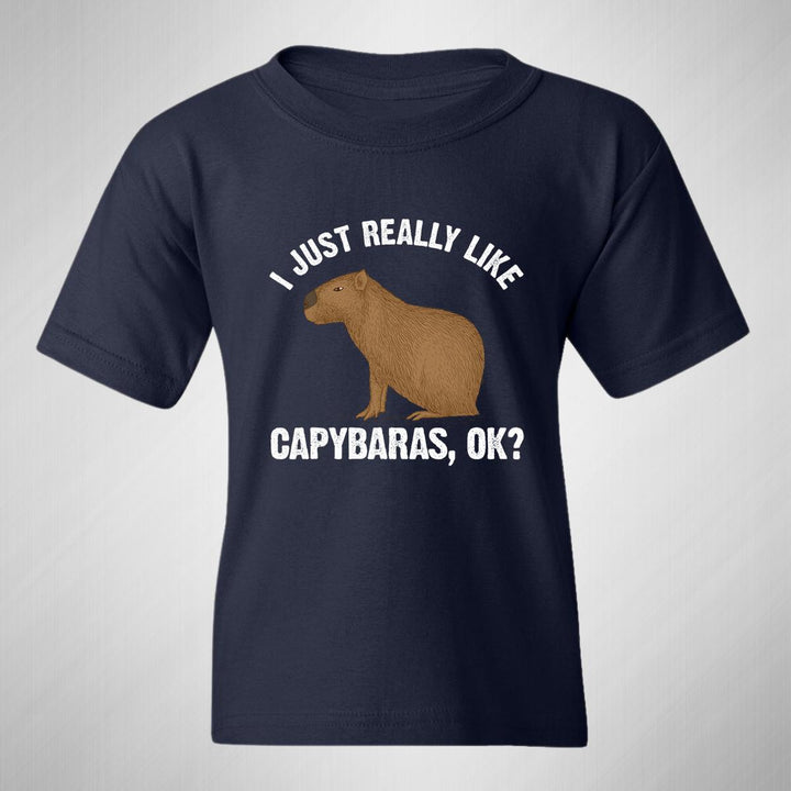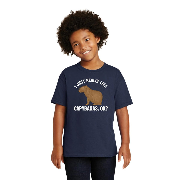 Playera infantil manga corta, cuello redondo para niño o niña nueva, diseño Capibara Carpincho Frases original impreso con tecnología DTG (directo a la prenda) tacto cero, uso casual o deportiva, 100% algodón chifón pre encogido, estructura tubular sin costuras laterales. Colores de camiseta: Negro, Azul Marino.
