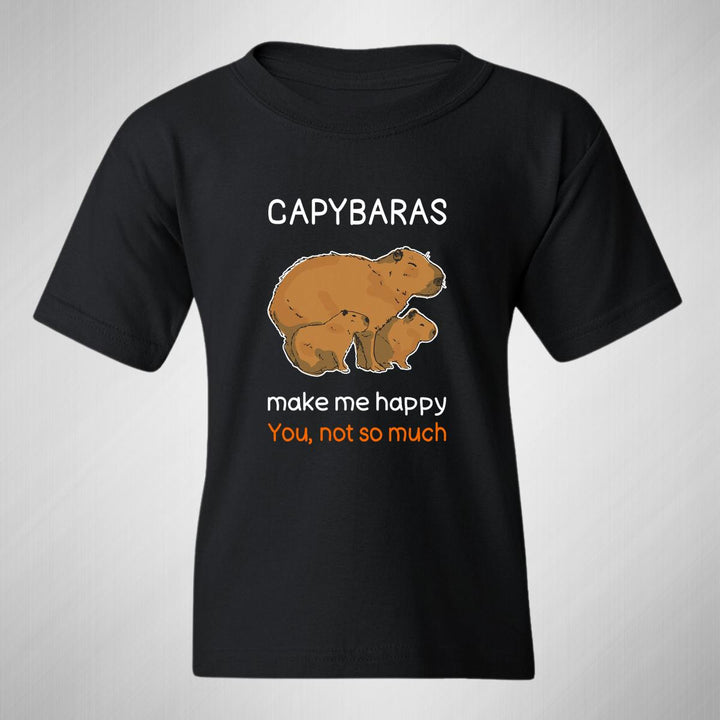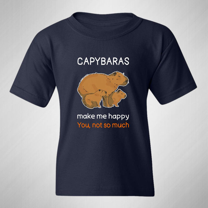 Playera infantil manga corta, cuello redondo para niño o niña nueva, diseño Capibara Carpincho Frases original impreso con tecnología DTG (directo a la prenda) tacto cero, uso casual o deportiva, 100% algodón chifón pre encogido, estructura tubular sin costuras laterales. Colores de camiseta: Negro, Azul Marino.