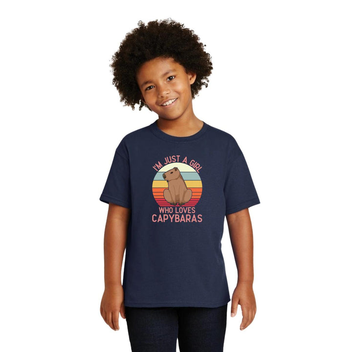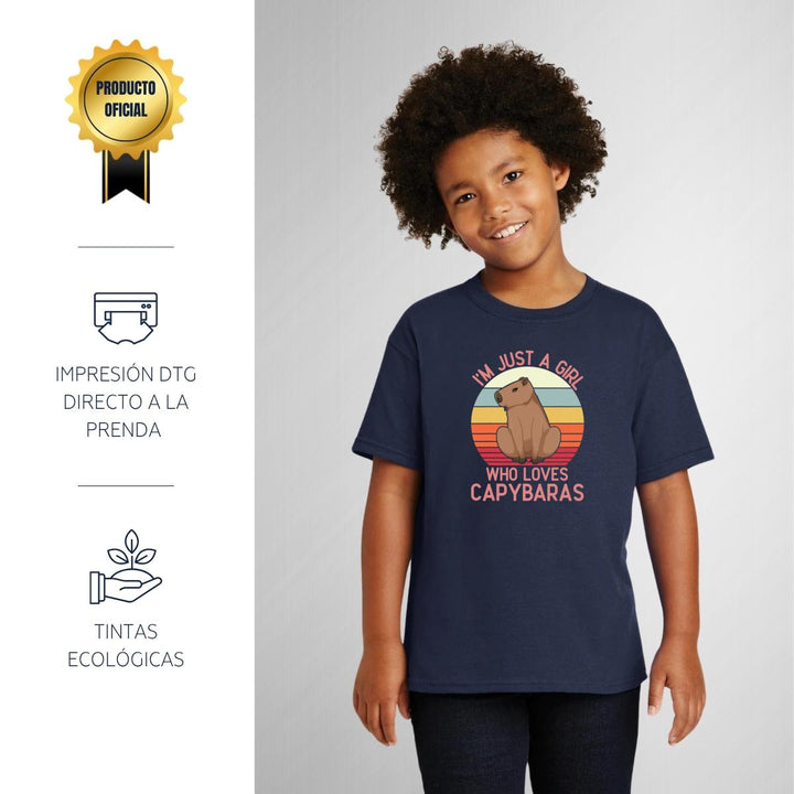 Playera infantil manga corta, cuello redondo para niño o niña nueva, diseño Capibara Carpincho Frases original impreso con tecnología DTG (directo a la prenda) tacto cero, uso casual o deportiva, 100% algodón chifón pre encogido, estructura tubular sin costuras laterales. Colores de camiseta: Negro, Blanco, Azul Marino.