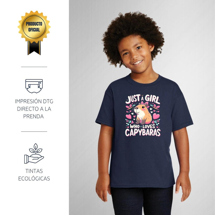 Playera infantil manga corta, cuello redondo para niño o niña nueva, diseño Capibara Carpincho Frases original impreso con tecnología DTG (directo a la prenda) tacto cero, uso casual o deportiva, 100% algodón chifón pre encogido, estructura tubular sin costuras laterales. Colores de camiseta: Negro, Azul Marino.