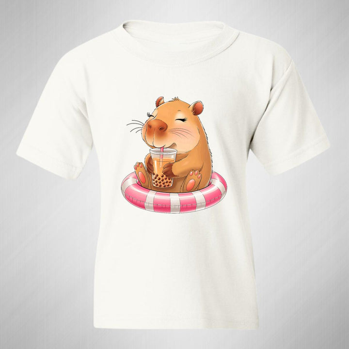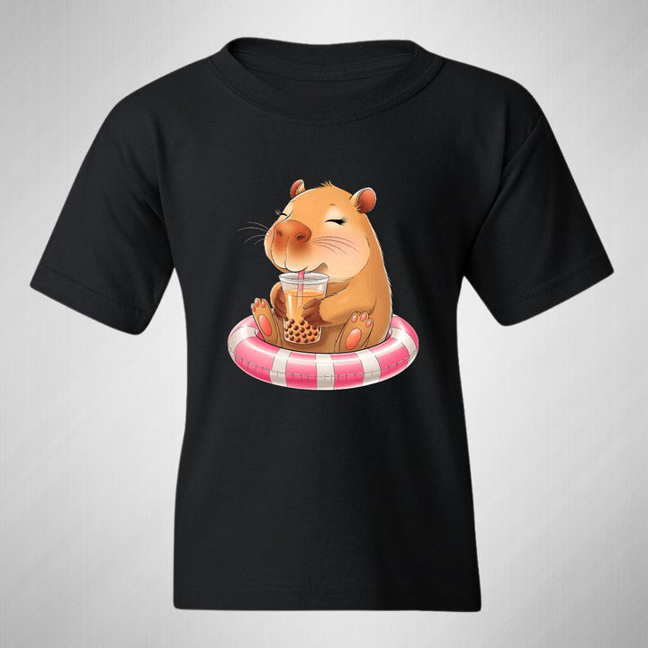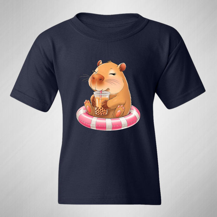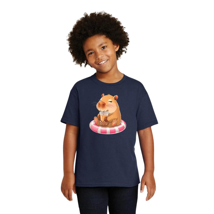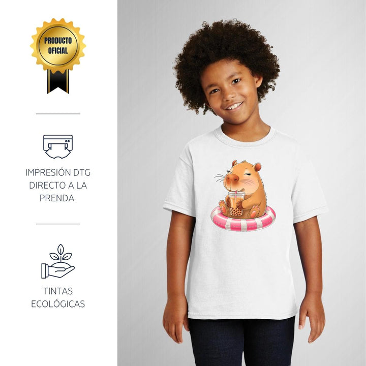 Playera infantil manga corta, cuello redondo para niño o niña nueva, diseño Capibara Carpincho Frases original impreso con tecnología DTG (directo a la prenda) tacto cero, uso casual o deportiva, 100% algodón chifón pre encogido, estructura tubular sin costuras laterales. Colores de camiseta: Negro, Blanco, Azul Marino.