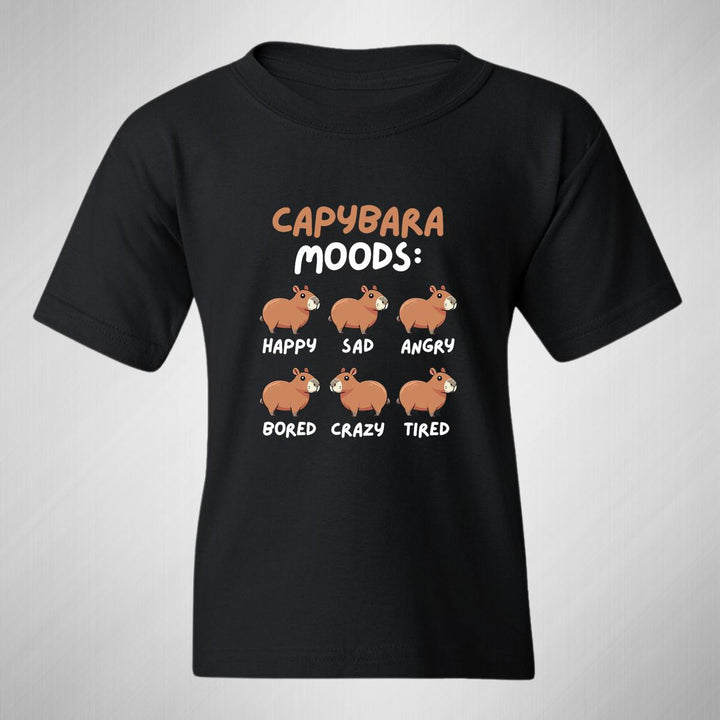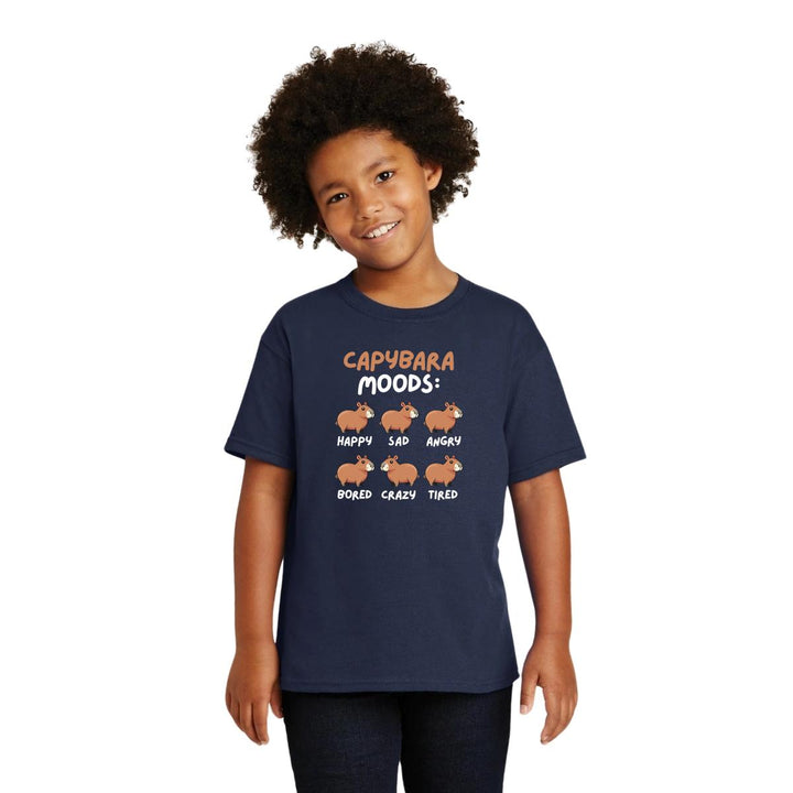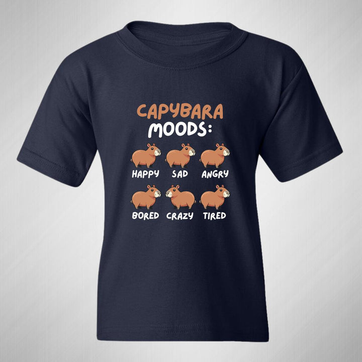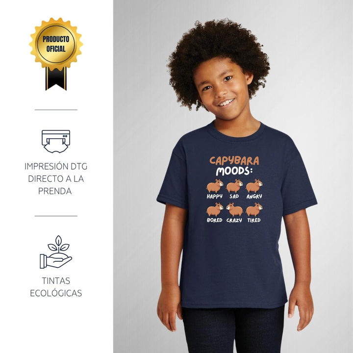 Playera infantil manga corta, cuello redondo para niño o niña nueva, diseño Capibara Carpincho Frases original impreso con tecnología DTG (directo a la prenda) tacto cero, uso casual o deportiva, 100% algodón chifón pre encogido, estructura tubular sin costuras laterales. Colores de camiseta: Negro, Azul Marino.