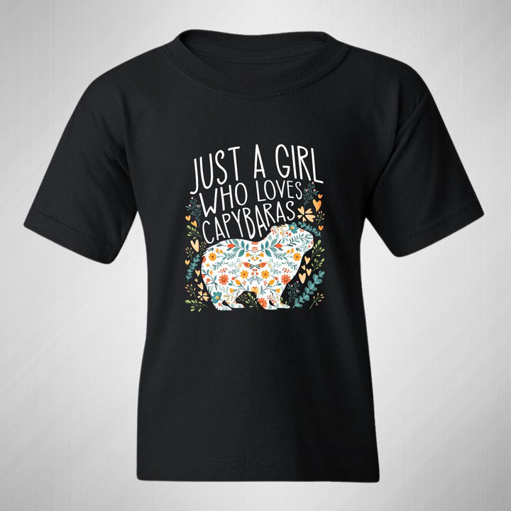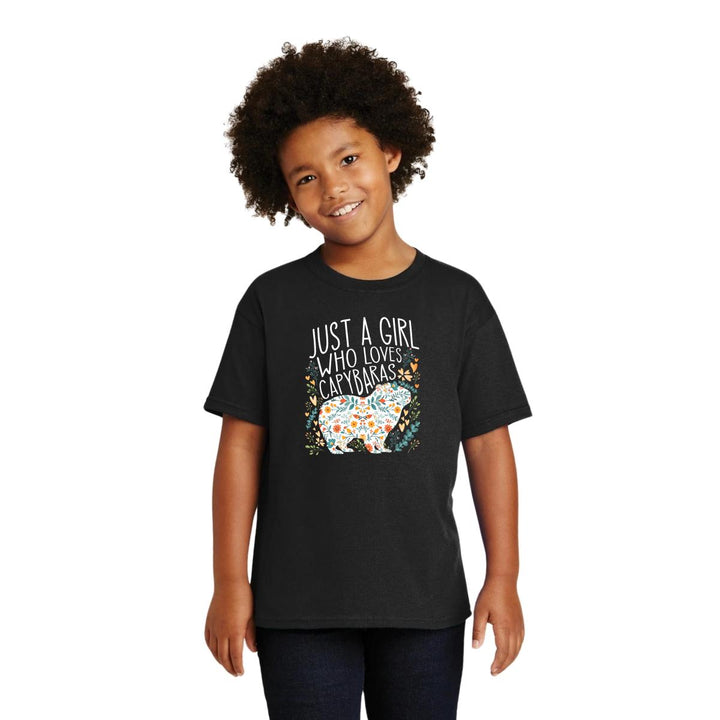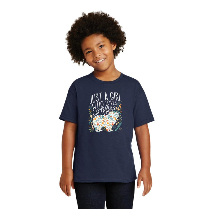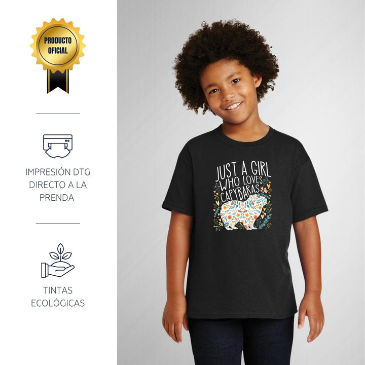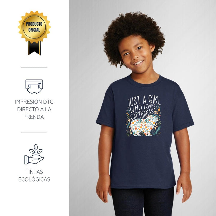 Playera infantil manga corta, cuello redondo para niño o niña nueva, diseño Capibara Carpincho Frases original impreso con tecnología DTG (directo a la prenda) tacto cero, uso casual o deportiva, 100% algodón chifón pre encogido, estructura tubular sin costuras laterales. Colores de camiseta: Negro, Azul Marino.