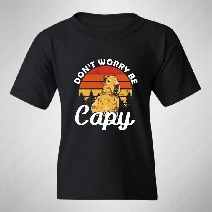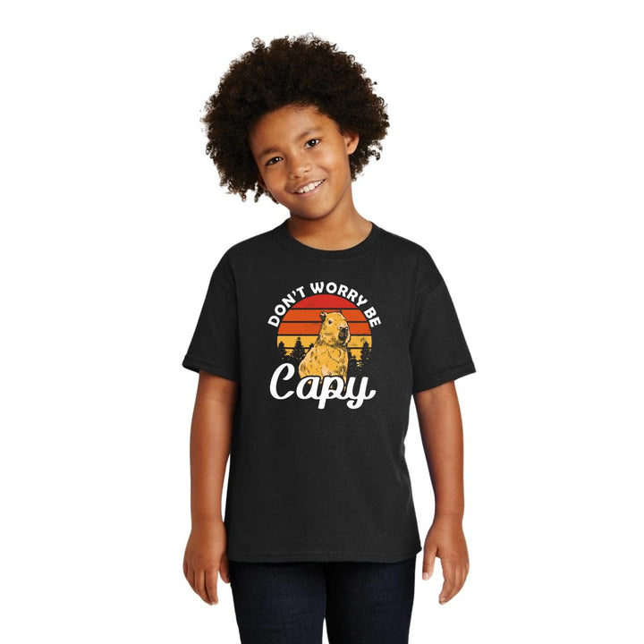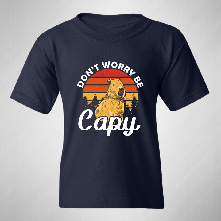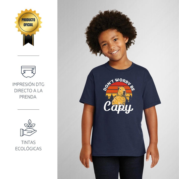 Playera infantil manga corta, cuello redondo para niño o niña nueva, diseño Capibara Carpincho Frases original impreso con tecnología DTG (directo a la prenda) tacto cero, uso casual o deportiva, 100% algodón chifón pre encogido, estructura tubular sin costuras laterales. Colores de camiseta: Negro, Azul Marino.